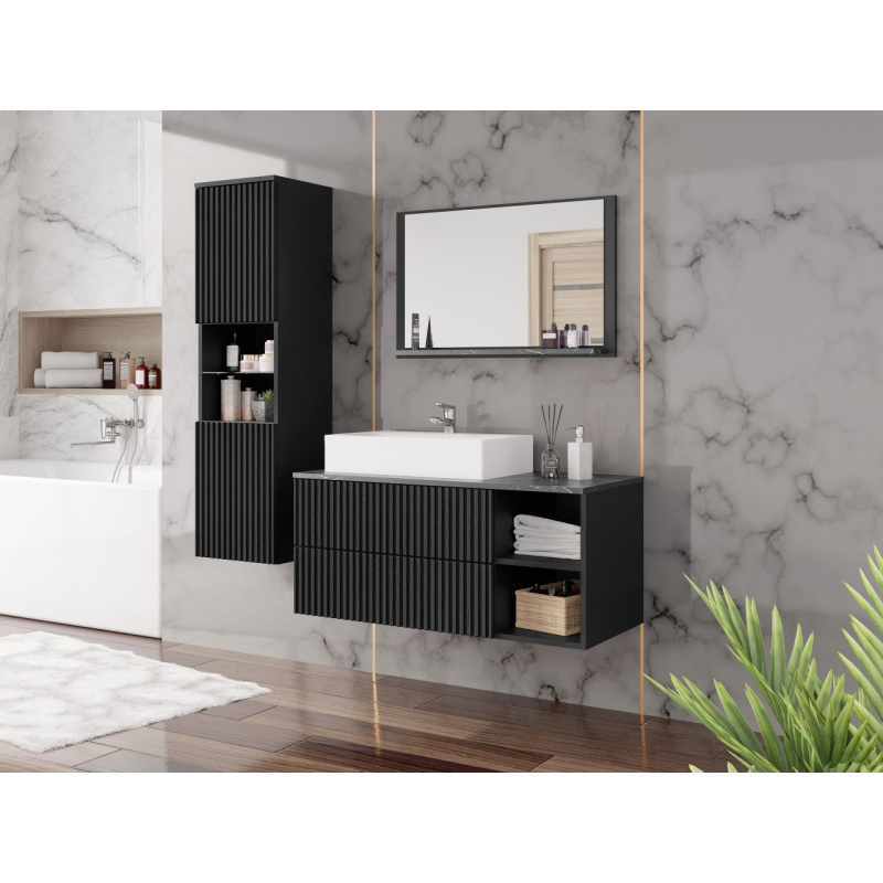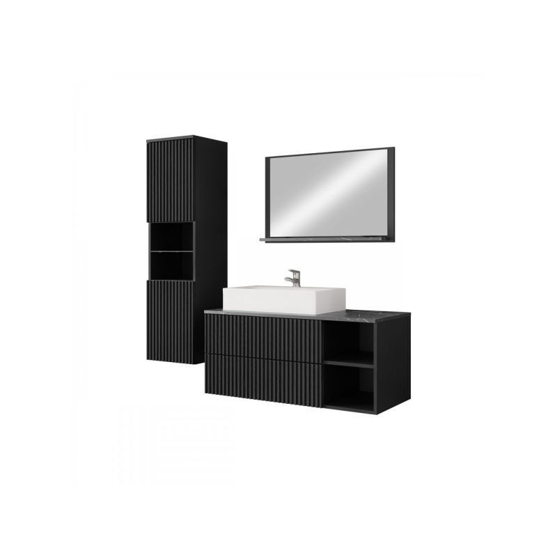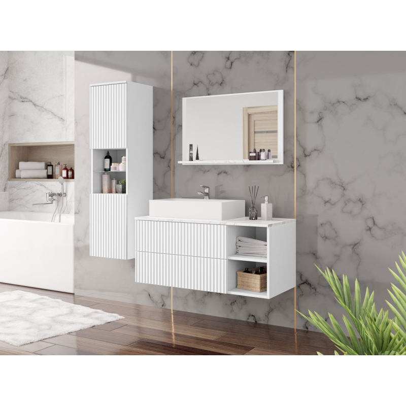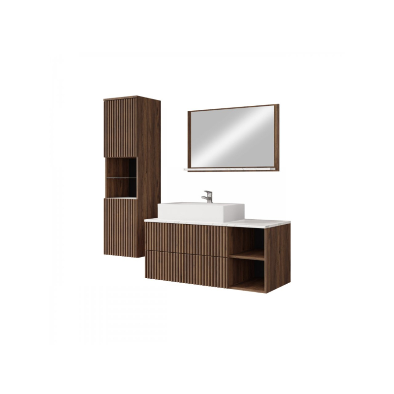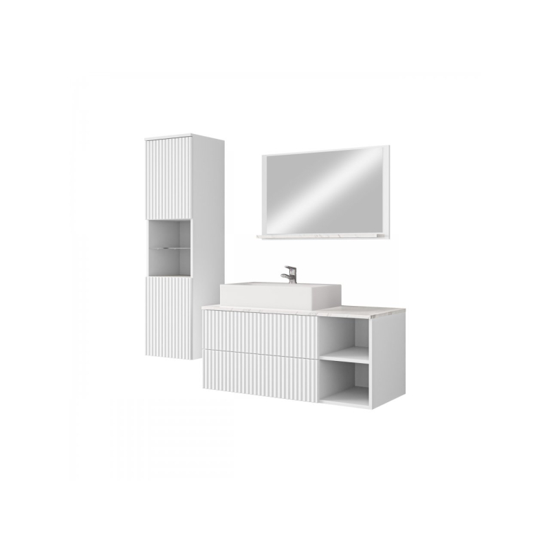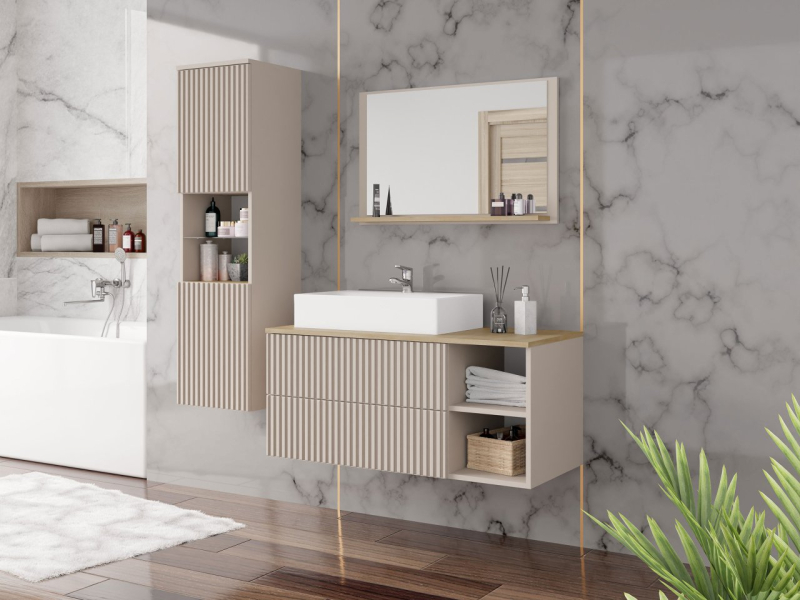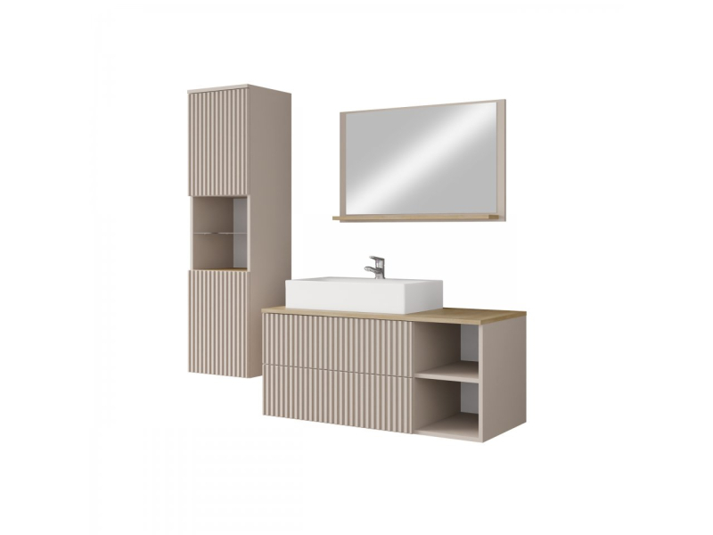Nábytková sestava Kiegi Ryfel II dodá vaší koupelně moderní ráz. Vkusně zvolené barvy dokonale ladí se vzorovanými i hladkými obklady. Drážkované dekory zase dodávají interiéru koupelny poněkud dynamiky. Symetrické frézy jsou módní dekorací nábytku. Jejich minimalistický design dokonale ladí s dekorem velkých i malých koupelen.