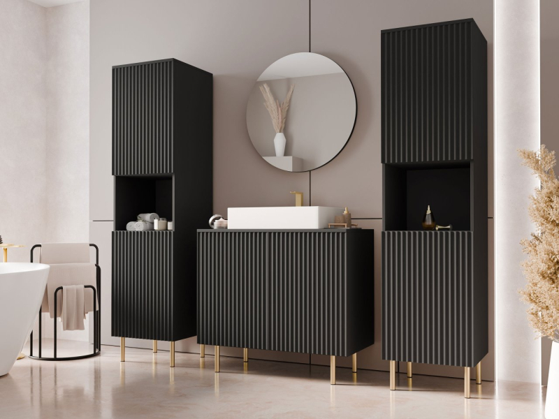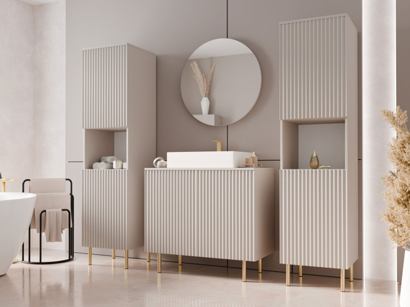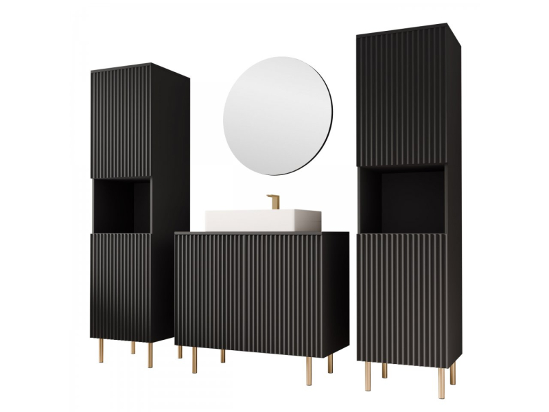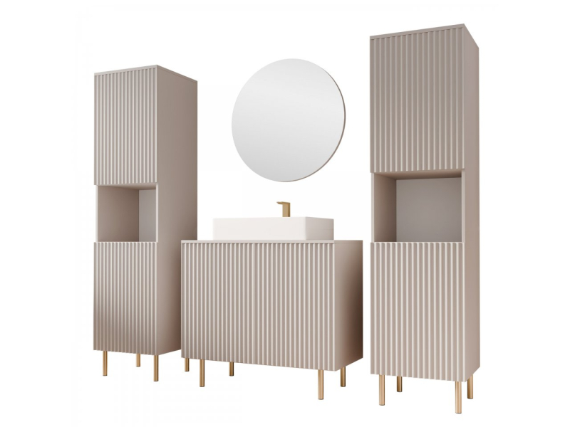 Koupelnový nábytek Nawil VI vám pomůže vytvořit stylový prostor, který zaujme svým vzhledem i praktičností. Krásně frézované čelní strany a zlaté nohy dokonale doplní vaši koupelnu. Sada obsahuje zrcadlo, skříňku pod umyvadlo a podstavec. Můžete si také dokoupit umyvadlo na desku.
