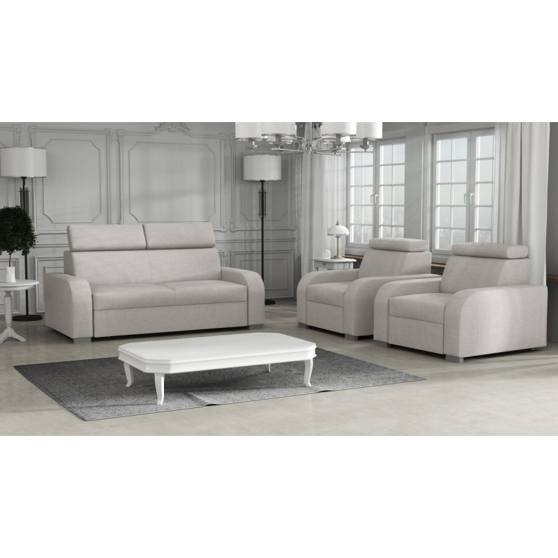 Sedací souprava se skládá z pohodlné třímístné pohovky a dvou křesel, která dokonale odpovídají současným trendům uspořádání.