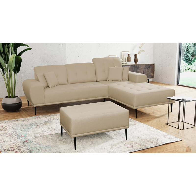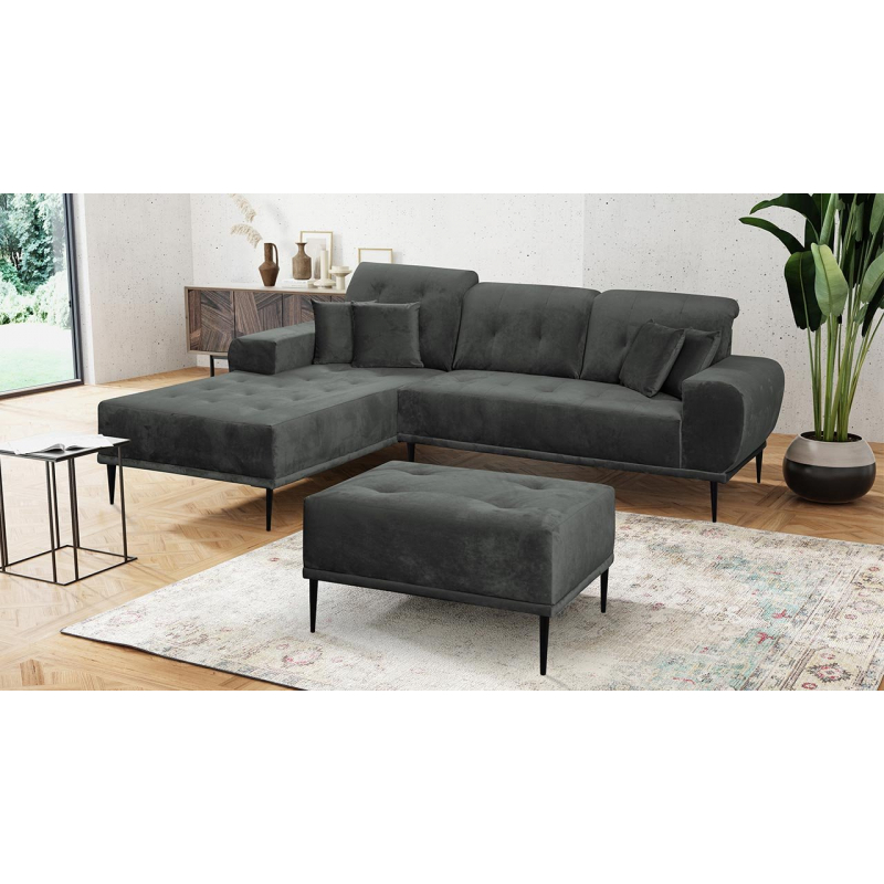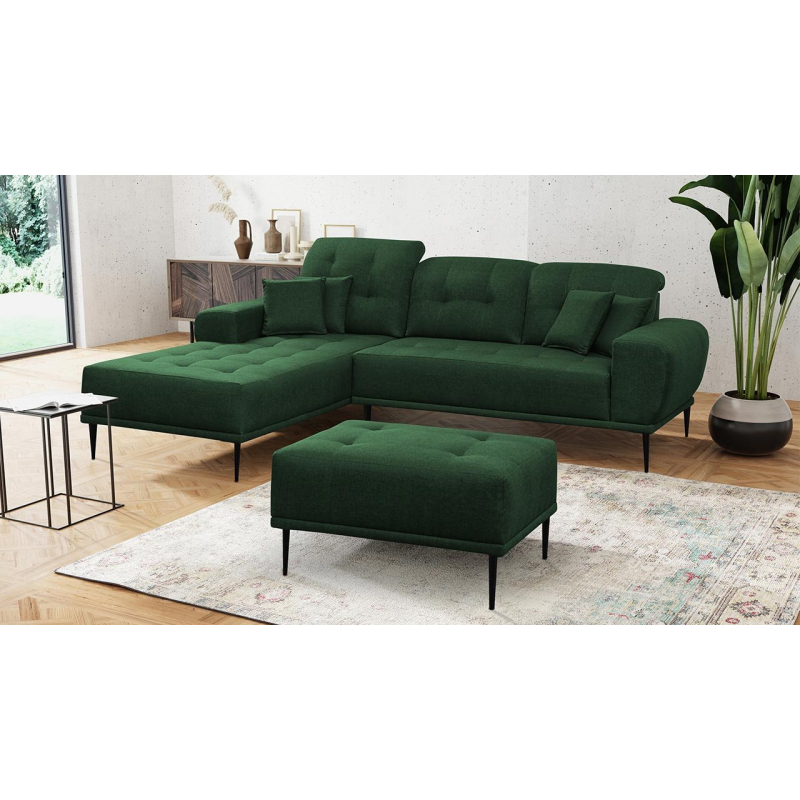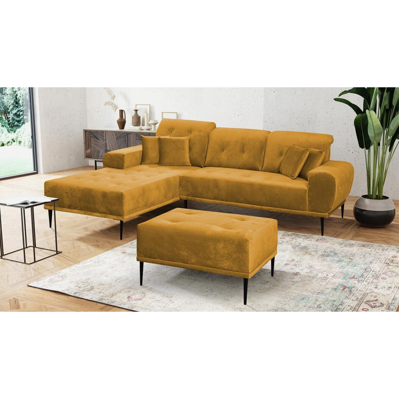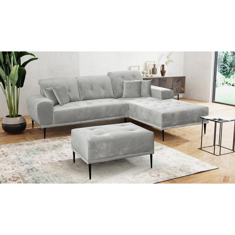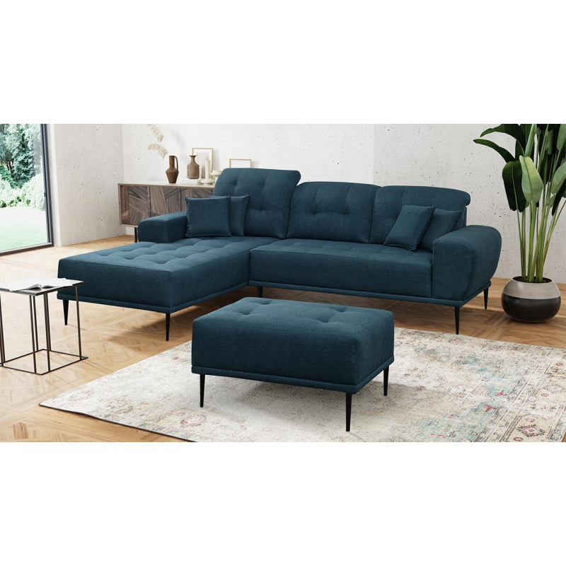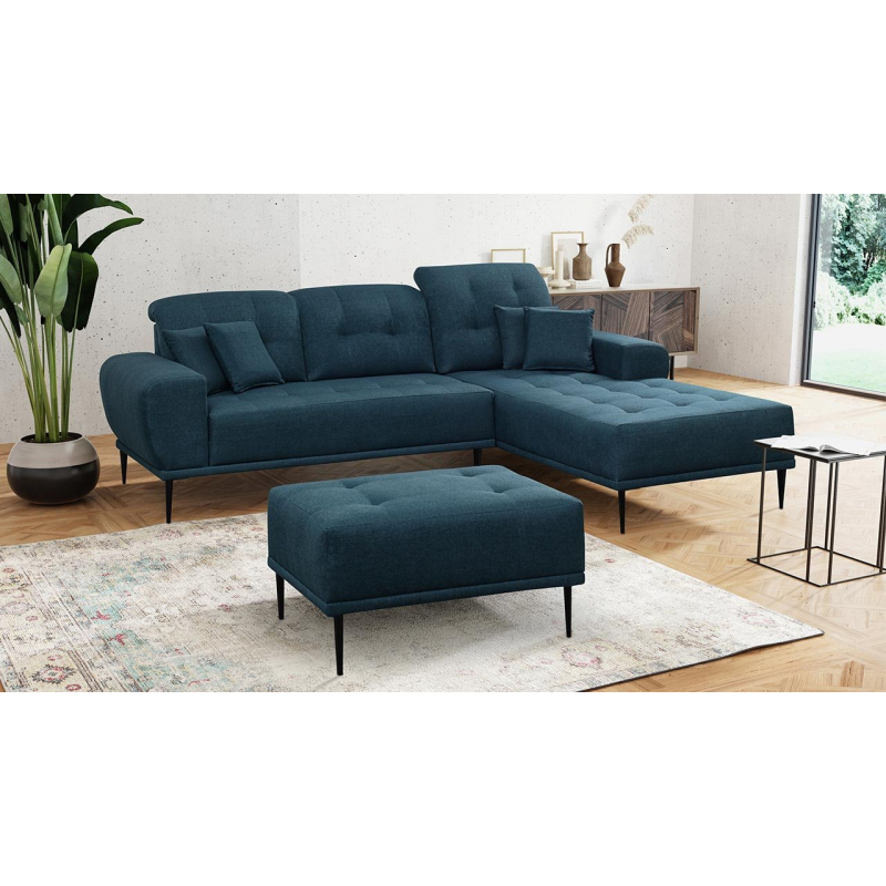 Hledáte moderní, pohodlnou sadu s taburetem? Odpočinková souprava Huguk je něco pro vás! Moderní charakter sedačky ovlivňuje její jednoduchý tvar a kovové nohy, které jí dodávají lehkost. Pohodlí se promítá do použitých komponentů: vlnité pružiny a elastická pěna. Rohové opěrky hlavy jsou navíc polohovatelné, což umožní jejich přizpůsobení vašim aktuálním potřebám. Zajímavým prvkem jsou také polštáře. Souprava obsahuje 4 malé polštářky se zipem. Styl sedačky a taburetky zvýrazňuje také použitá látka, která je příjemná na dotek. Perfektně ladí s prošíváním na sedáku a opěradle.