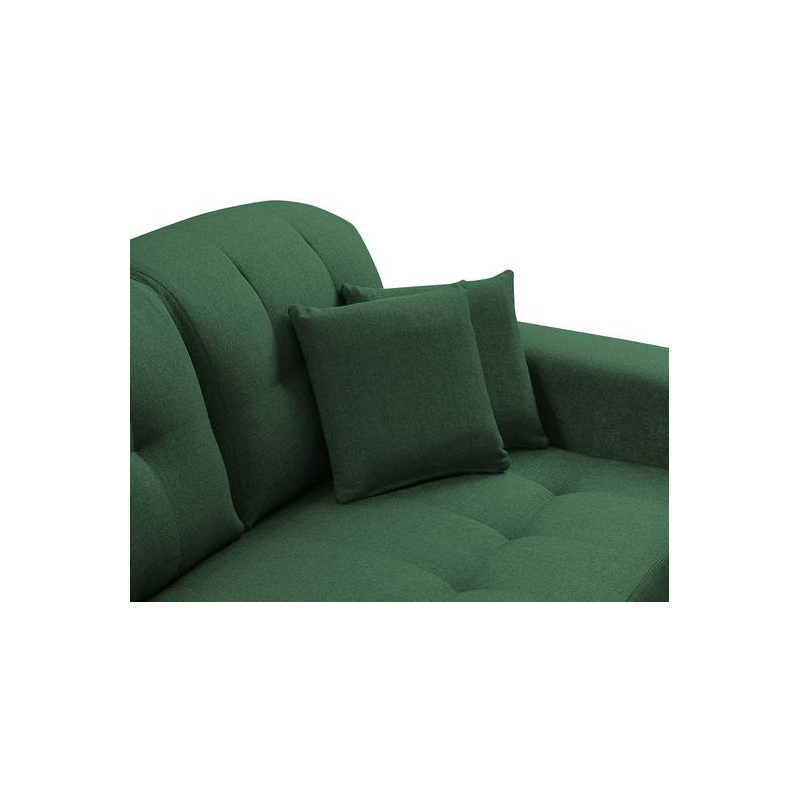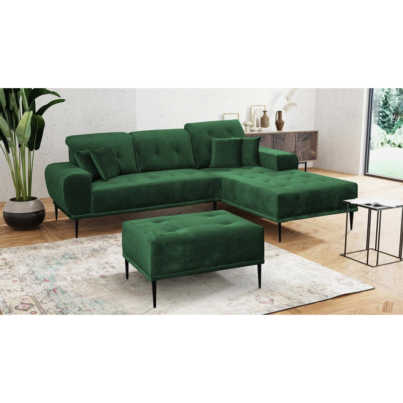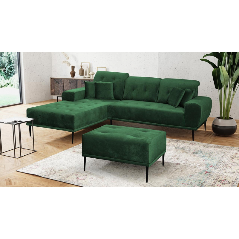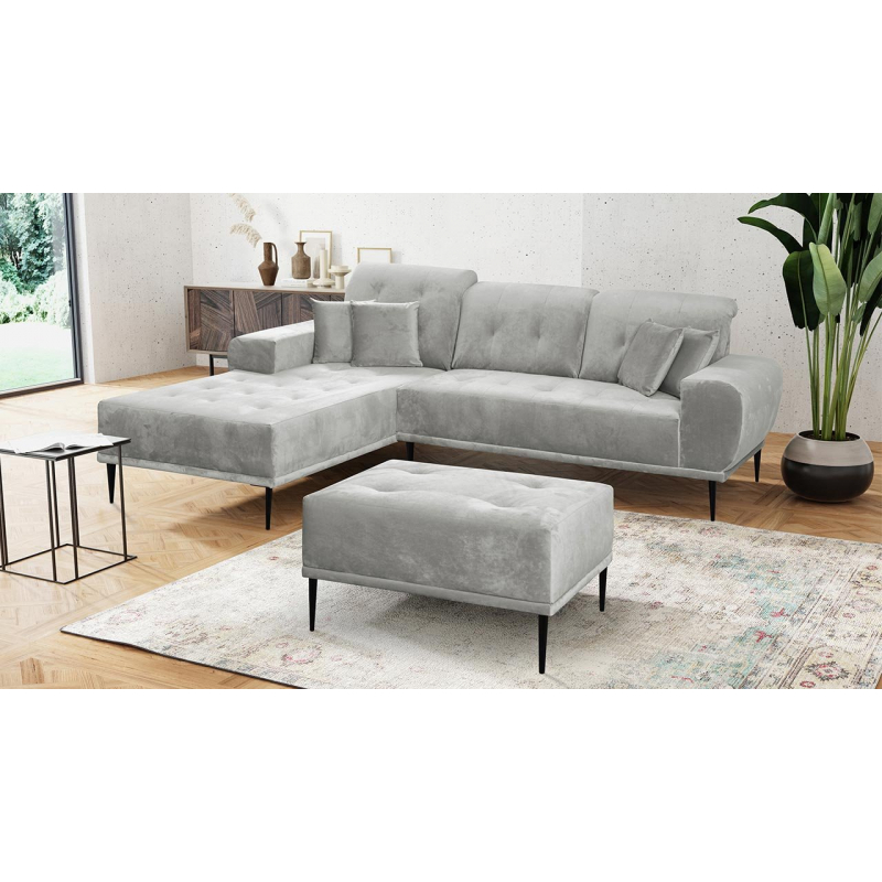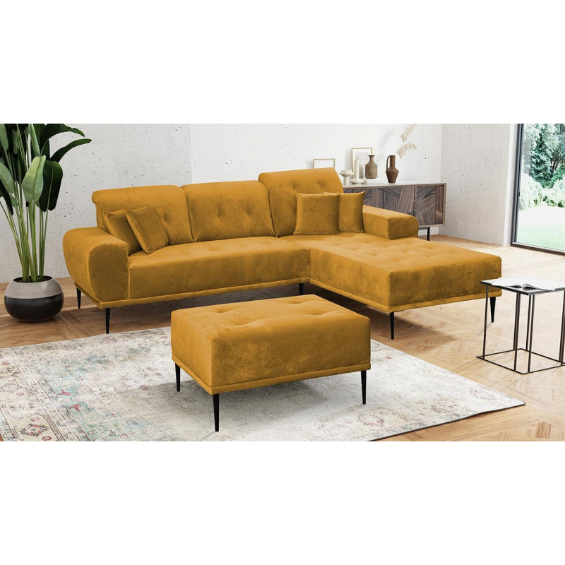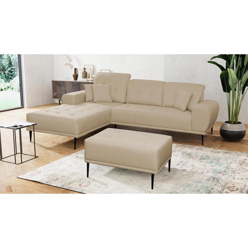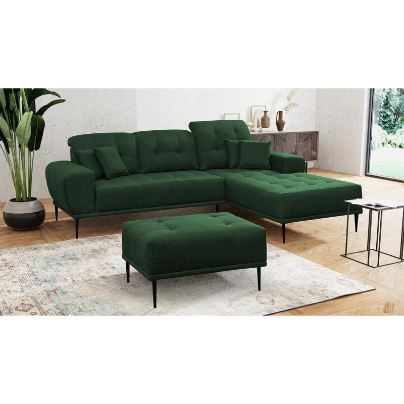 Hledáte moderní, pohodlnou sadu s taburetem? Odpočinková souprava Huguk je něco pro vás! Moderní charakter sedačky ovlivňuje její jednoduchý tvar a kovové nohy, které jí dodávají lehkost. Pohodlí se promítá do použitých komponentů: vlnité pružiny a elastická pěna. Rohové opěrky hlavy jsou navíc polohovatelné, což umožní jejich přizpůsobení vašim aktuálním potřebám. Zajímavým prvkem jsou také polštáře. Souprava obsahuje 4 malé polštářky se zipem. Styl sedačky a taburetky zvýrazňuje také použitá látka, která je příjemná na dotek. Perfektně ladí s prošíváním na sedáku a opěradle.