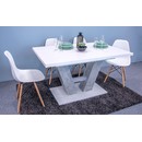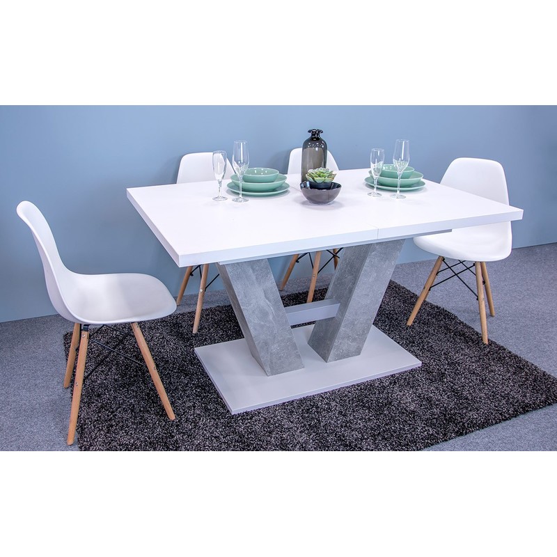 Stůl Concrete má rozkládací horní část, která zvětšuje jeho využitelný prostor na délku 177 cm a čtyři židle stabilní konstrukce.