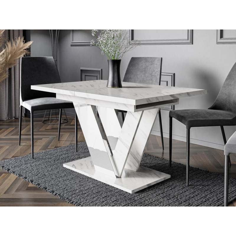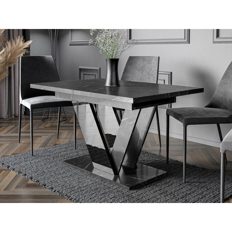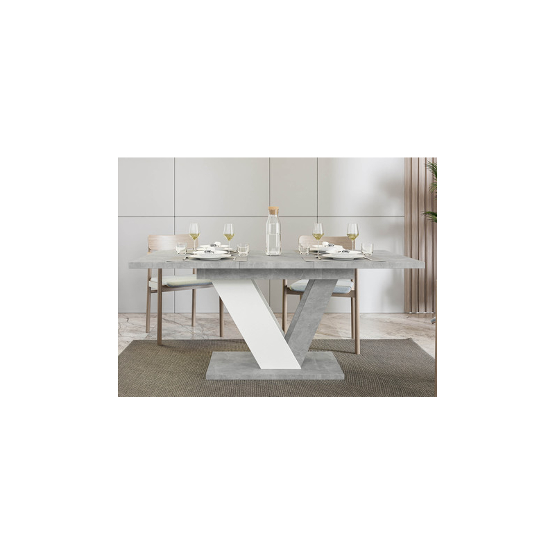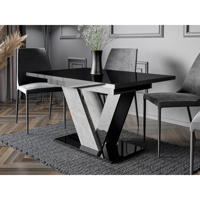 Stojí za to věnovat pozornost zajímavému základu. Svým tvarem připomíná písmeno v. Vizuální celek zdůrazňují jedinečné barevné kombinace. Můžete si vybrat mimo jiné: kombinace s imitací betonu nebo mramoru. Roztahovací stůl je ideální volbou pro každou příležitost.