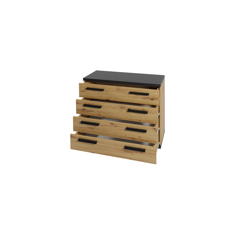 Komoda K4SZ Mins MS01 je návrh, který bude ideální jak do ložnice, obývacího pokoje, tak do chodby. Komoda se vyznačuje kombinací nadčasové černé barvy s teplou barvou ve stínu řemeslného dubu. Celý představuje nádech modernosti. Komoda byla vyrobena z vysoce kvalitní dřevotřísky.