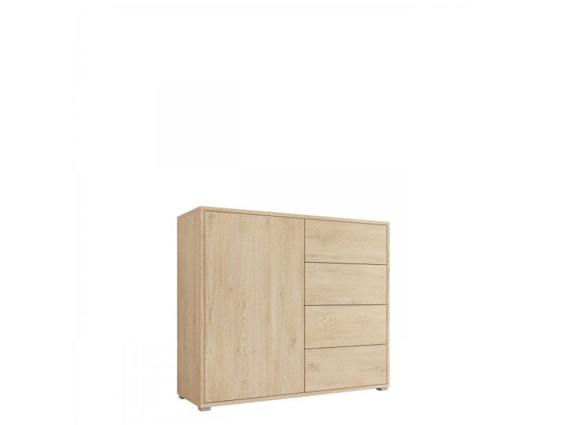Komoda do obývacího pokoje je vyrobena z kvalitní nábytkové desky, která je odolná proti poškrábání a poškození. Vnitřní prostor nabízí prostorné úložné prostory pro praktické předměty, které jsou snadno přístupné díky kuličkovému vedení v zásuvkách.