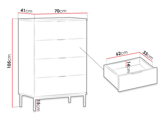 Komoda Finoti K4SZ nabízí praktický úložný prostor. Praktické zásuvky se stanou dokonalou základnou pro různé předměty nebo oblečení. Jednoduchý tvar doplňují tmavé odstíny předních ploch prolomené zlatým rámem a úchyty.