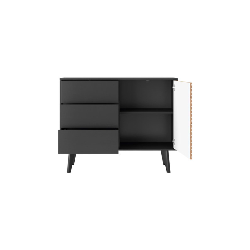Komoda má praktické police a zásuvky, které vám umožní efektivně uspořádat uložené věci. Nabízí také dostatek prostoru pro dekorace. Na její horní část můžete umístit ozdobné svícny, vázu s květinami nebo sentimentální vzpomínky na dovolenou. Skvěle zapadne do moderních a stylových interiérů, zejména těch s industriálním charakterem. Je vynikající volbou pro ty, kteří ocení funkčnost, kvalitu a estetiku.