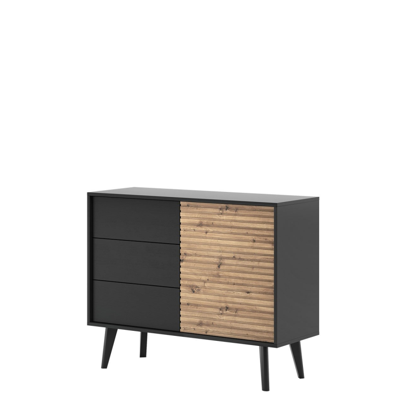 Módní a funkční komoda Mostero MSKSZ104 je ideální volbou pro milovníky loftového stylu. Krásná drážkovaná čela dodávají nábytku jedinečný charakter. Systém otevírání "PUSH TO OPEN" zajišťuje snadný a pohodlný přístup do vnitřního prostoru. Dřevěné nožky dodávají komodě eleganci a stabilitu a usnadňují udržování pořádku na podlaze.