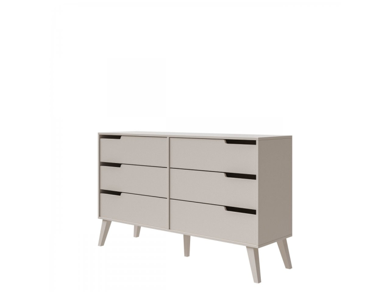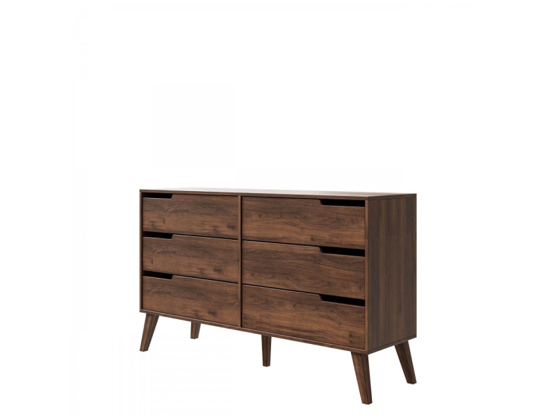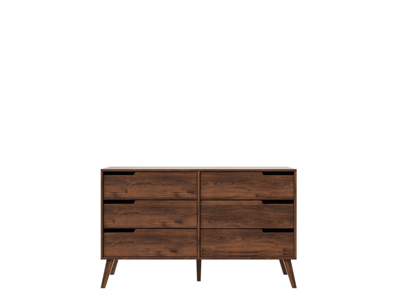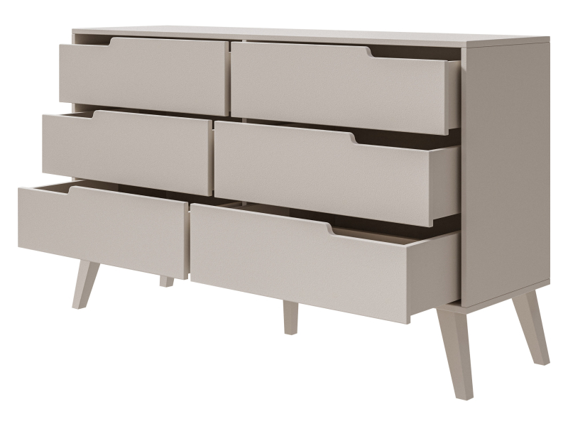 Čela zásuvek nemají tradiční úchytky – otevírají se pomocí diskrétních zářezů, což podtrhuje moderní charakter komody a zajišťuje jednotný, estetický povrch. Komoda je vybavena šesti prostornými zásuvkami, které nabízejí dostatek úložného prostoru. Celý kus je namontován na masivních dřevěných nohách, které dodávají konstrukci vizuální lehkost a vnášejí do interiéru teplý, přírodní akcent.