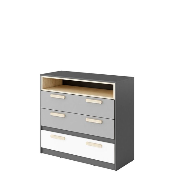 Komoda Pok je určena pro uložení doplňků v dětském pokoji. Moderní design nábytku dokonale zapadá do vkusu těch nejnáročnějších uživatelů. Interiér komody je naplněn řadou prostorných zásuvek, do kterých můžete uložit oblečení i jiné doplňky.