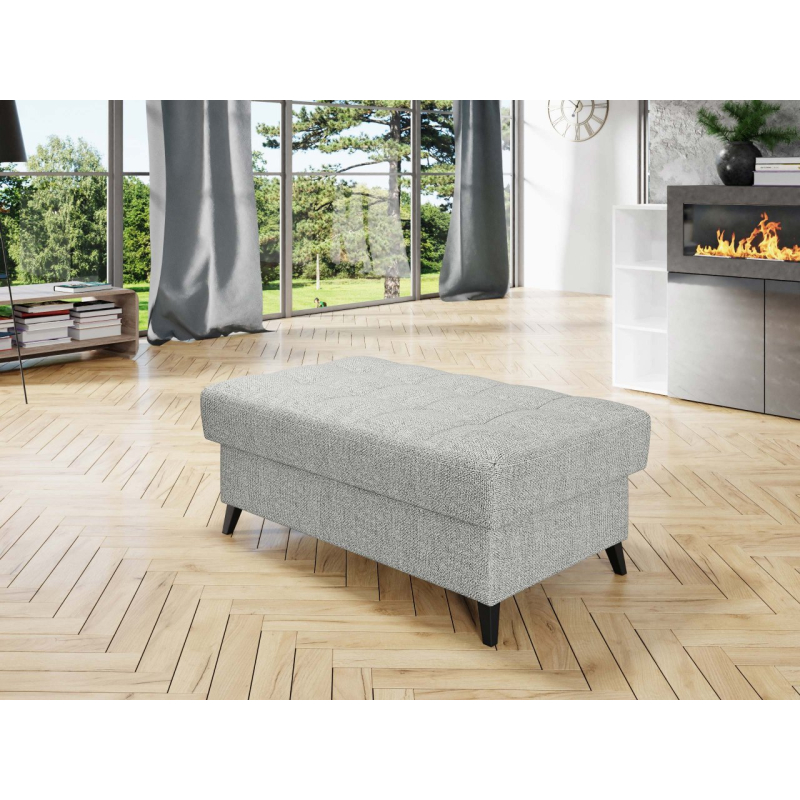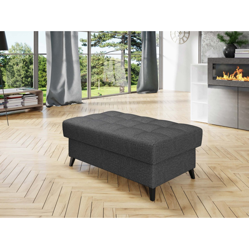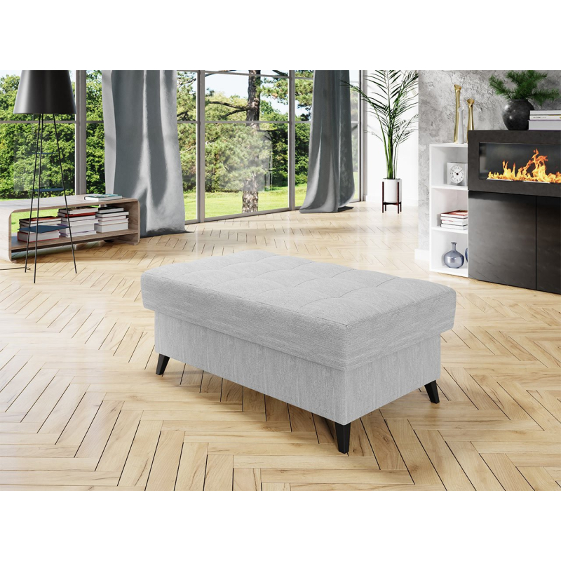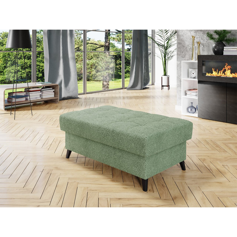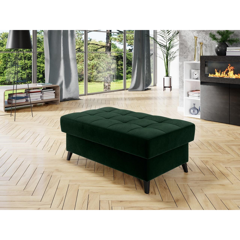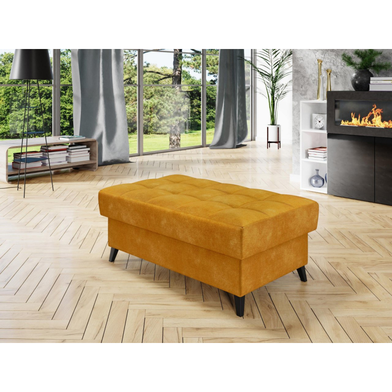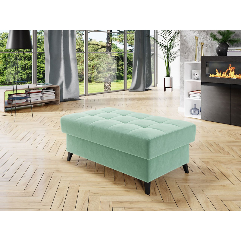 Materiály jsou odolné a příjemné na dotek. Design taburetu je doplněn hlubokým prošíváním a ozdobnými nohami.