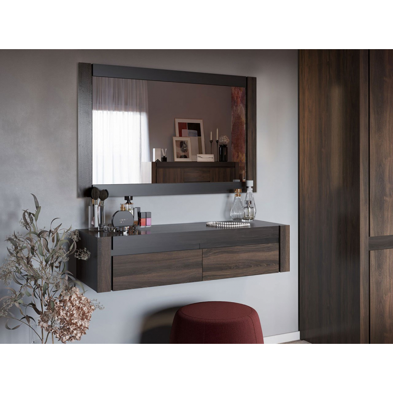 Toaletní stolek se skládá ze dvou prvků. Prvním je závěsný panel, který je vybaven dvěma prostornými zásuvkami. Nad ním můžete pověsit velké zrcadlo, které je součástí sady. Rám zrcadla barevně ladí se spodní skříňkou.