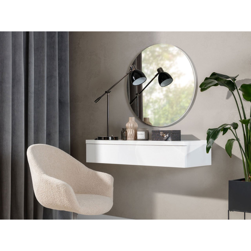 Ústředním prvkem toaletního stolku je kulaté, krásně vyrobené zrcadlo, které dokonale prosvětlí prostor a umožní pohodlné nanášení make-upu nebo péče o pleť. Zrcadlo také dodává pocit prostornosti a prosvětluje interiér.