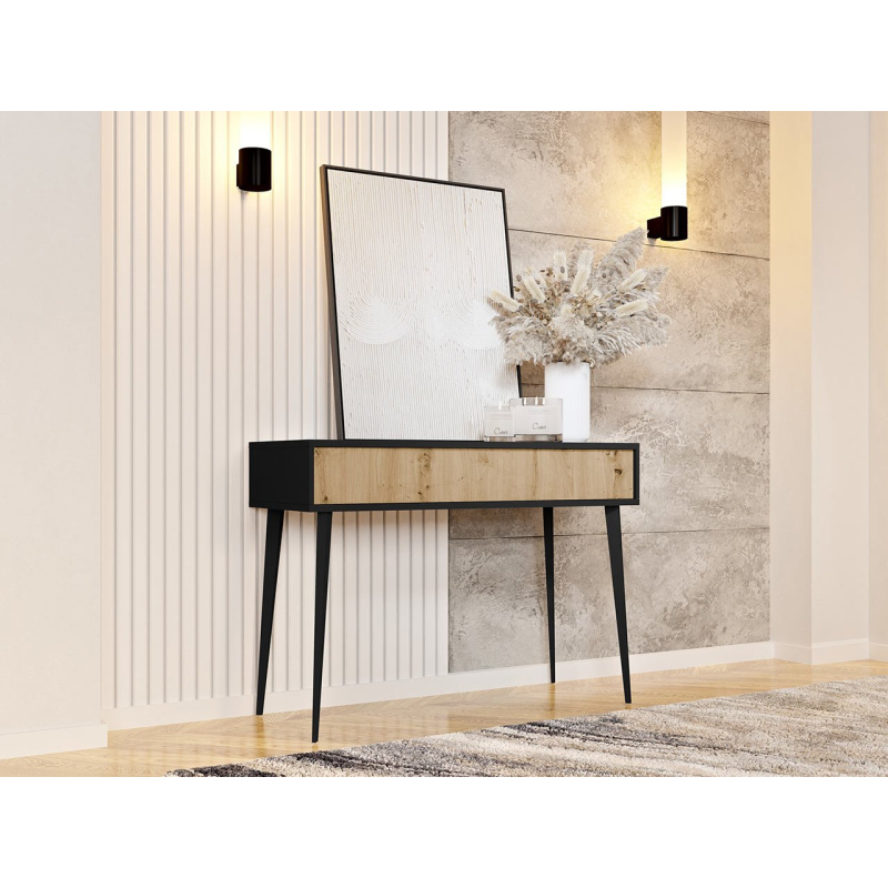 Konzole Oksawi 1SZ se bude skvěle hodit do každého interiéru a do každého koutu! Poskytuje dokonalý doplněk aranžmá a praktické řešení! Dokonale zapadne do tradičního, ale i rustikálního dekoru. Štíhlé a subtilní nohy dodávají kusu nábytku lehkost. Kombinace černé s barvou dubu dodává místnosti hřejivou atmosféru.