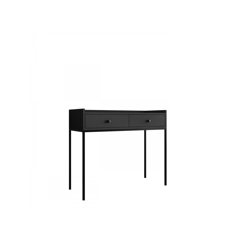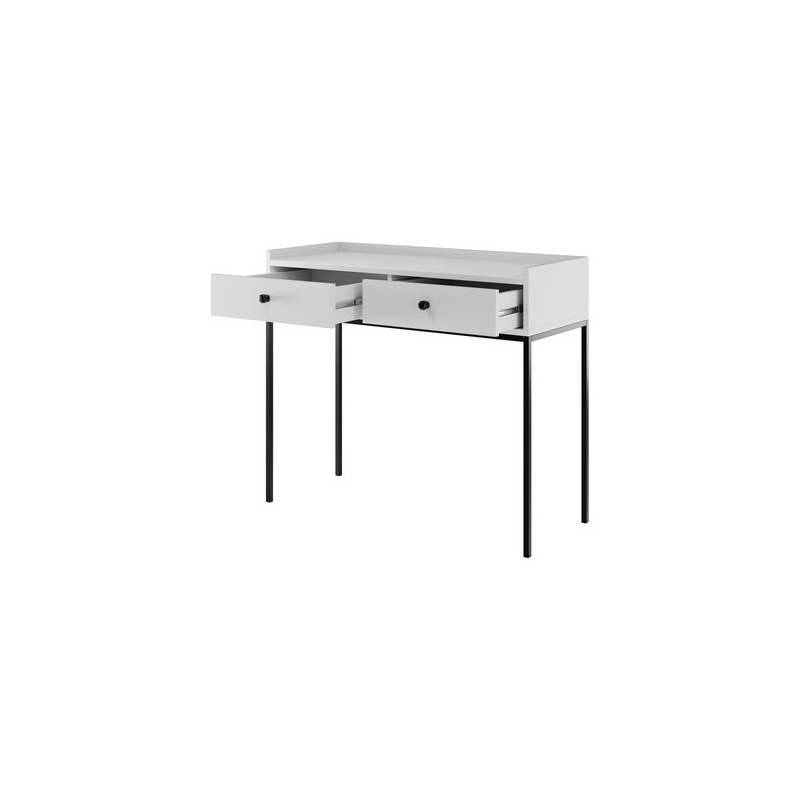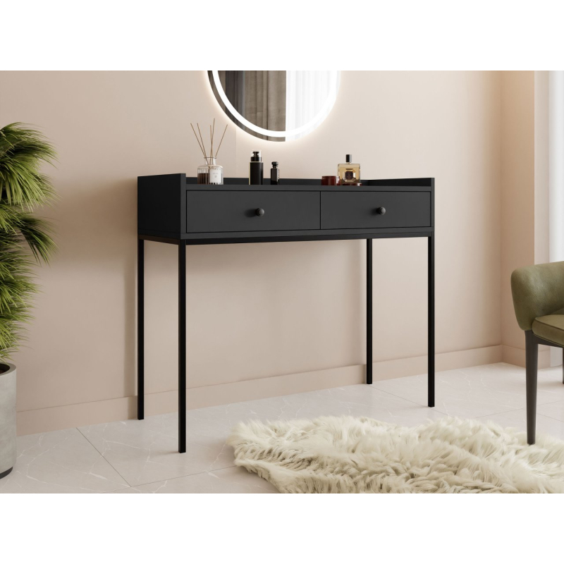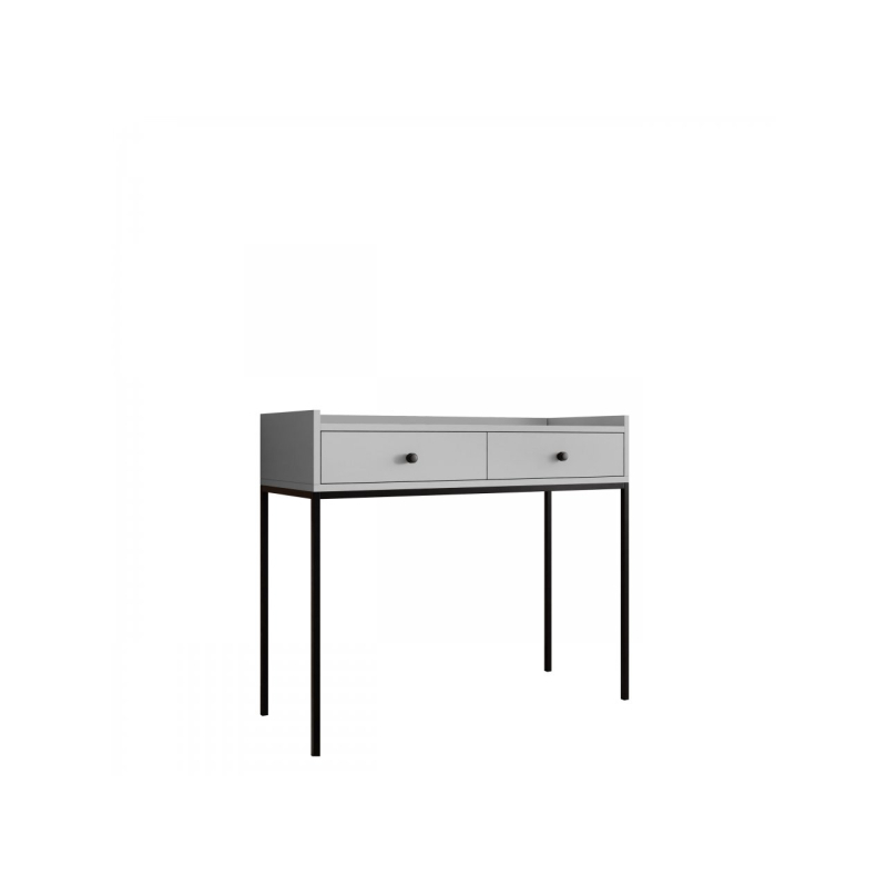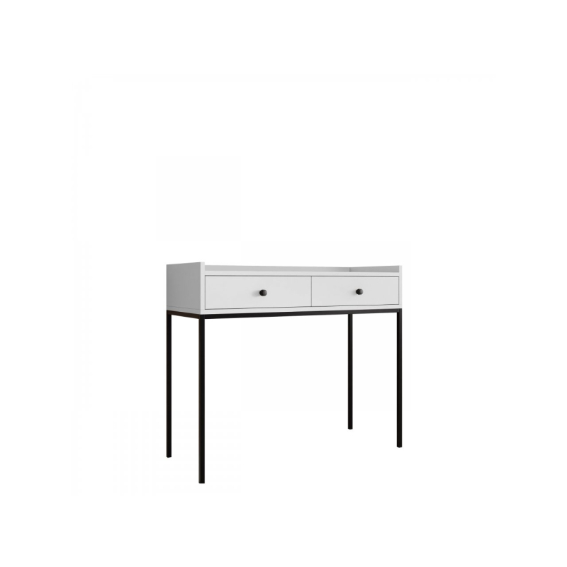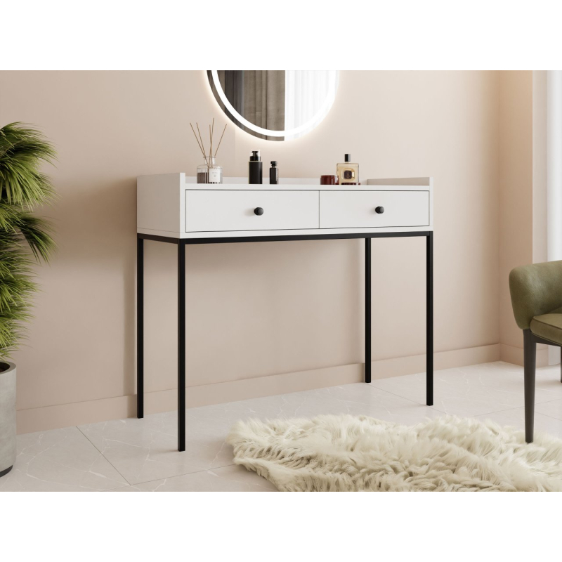 Toaletní stolek Tuzzirt 2SZ se zásuvkami je spojením funkčnosti a elegance. Jednoduchý tvar, praktické aplikace a univerzální design. To, co jej odlišuje především, jsou čela vyčnívající nad pracovní desku. To je skvělé řešení – při ranním líčení vám žádná kosmetika nespadne z toaletního stolku. Model dobře poslouží i jako konzola do předsíně nebo obývacího pokoje.
