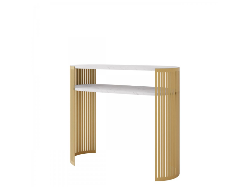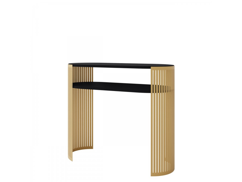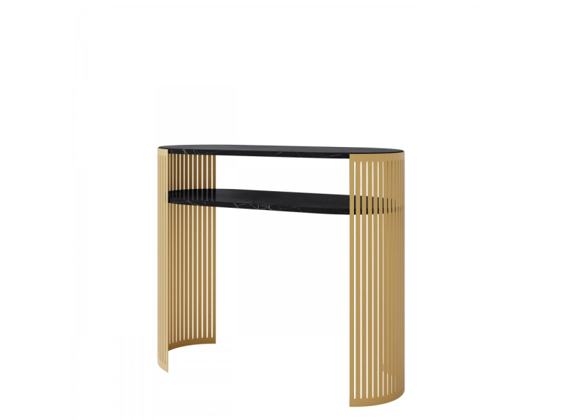 Konzolový stolek Zinzit Gold Oval je elegantní doplněk, který dodá každému interiéru lehkost a styl. Jeho štíhlý tvar a zaoblená horní deska vytvářejí harmonický celek, který dokonale doplňuje interiéry v moderním, okouzlujícím nebo minimalistickém stylu. Masivní ocelový rám s zlatým nátěrem zajišťuje stabilitu a je také vysoce dekorativním doplňkem.