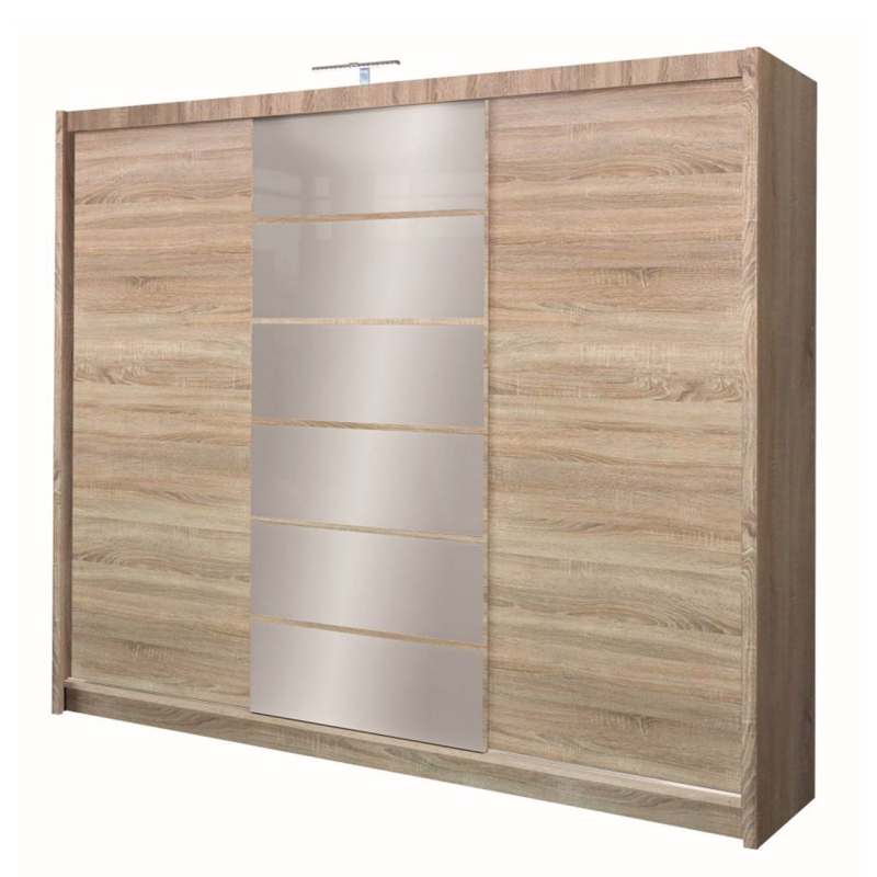 Posuvná skříň Kalifornia je návrh pro moderní i klasické interiéry. Velká a prostorná šatní skříň se systémem posuvných dveří s LED osvětlením v ceně. Vyrobena z pevných a odolných materiálů. Má mnoho polic, které umožňují oddělit oblečení, což se stává užitečným, když máte ve skříni hodně oblečení. Je k dispozici v několika barevných variantách.