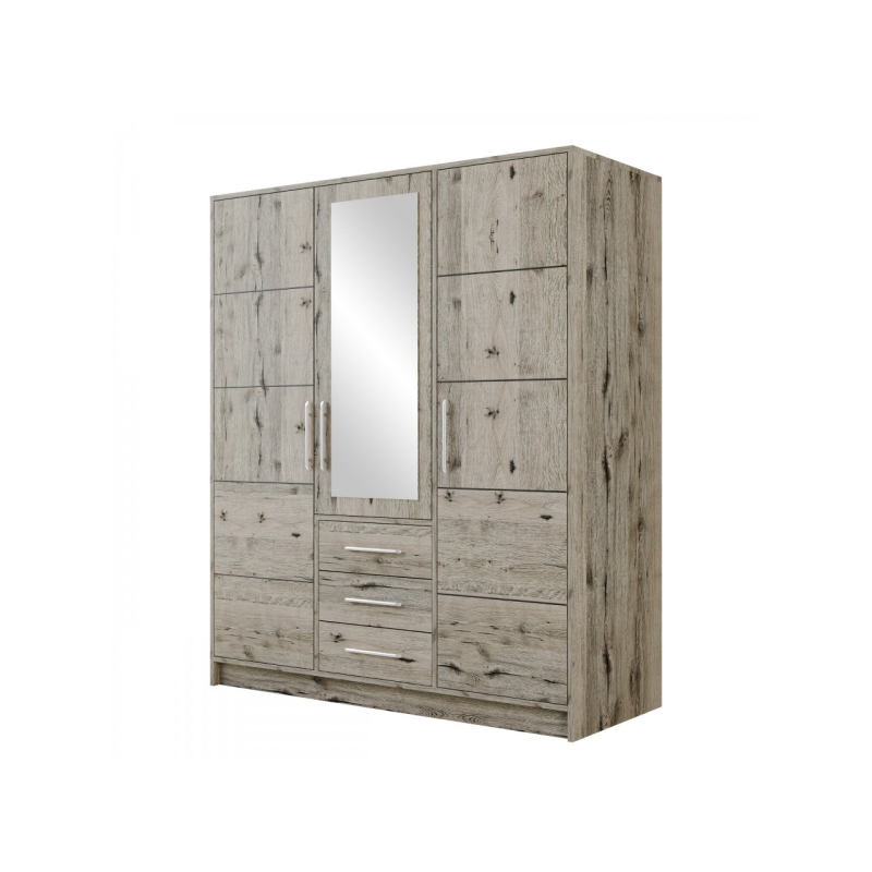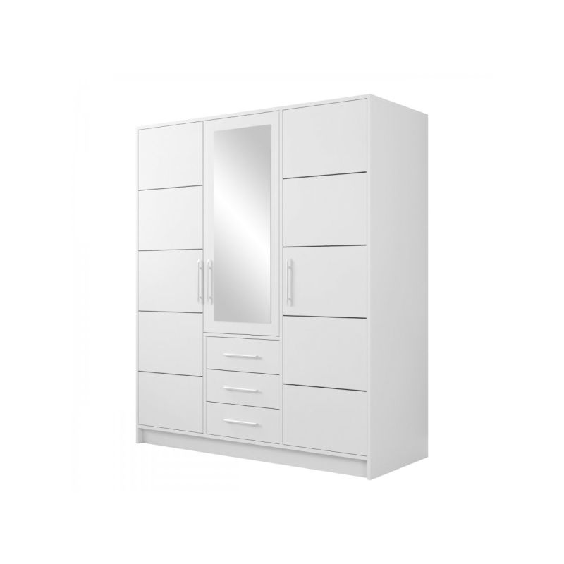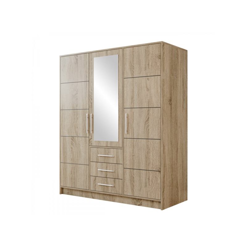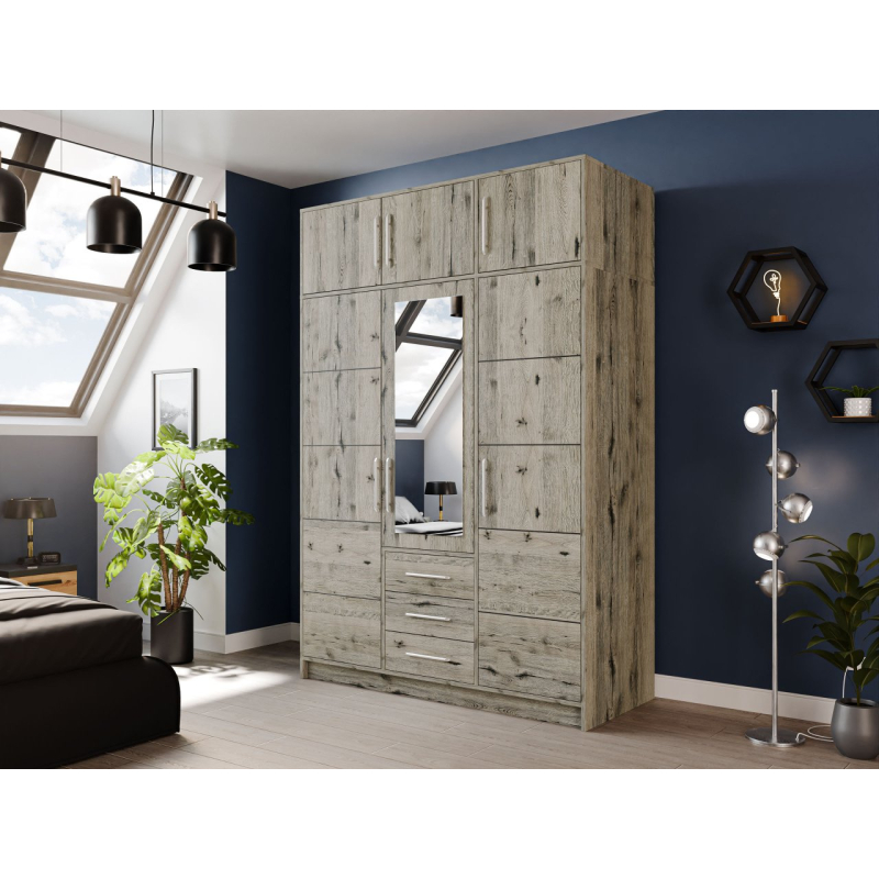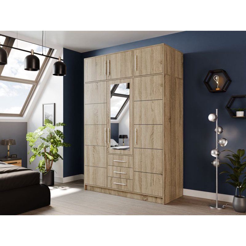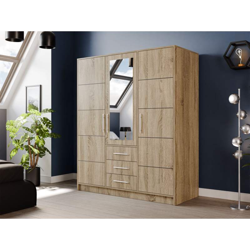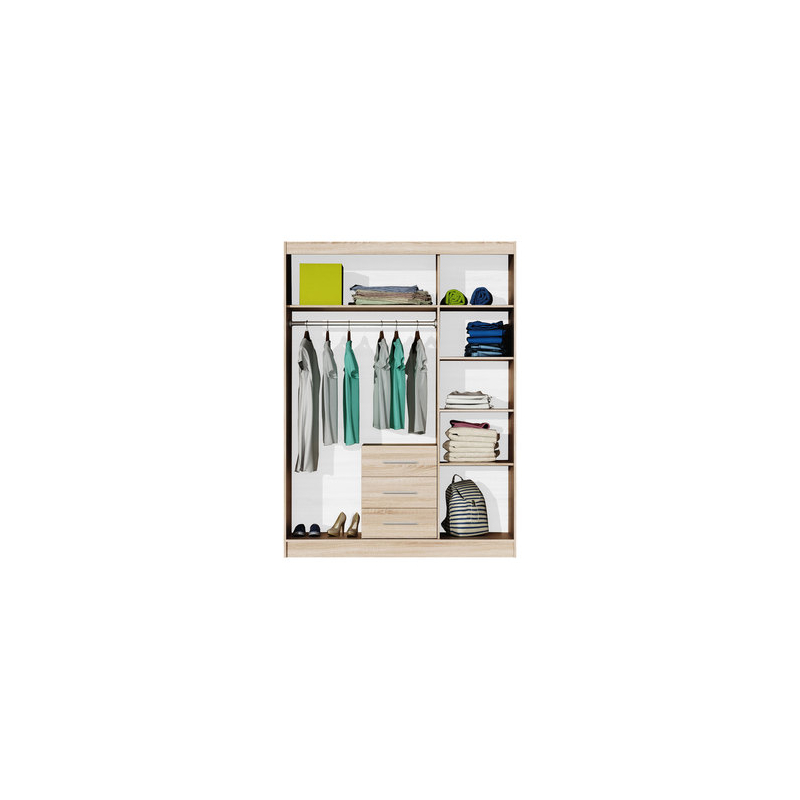 Třídveřová šatní skříň má bohatý vnitřek, se kterým si dokonale uspořádáte oblečení a doplňky. Uvnitř naleznete prostorné úložné prostory, prostorné zásuvky a tyč na šaty, která je jako stvořená pro uložení šatů, košil a bund.
