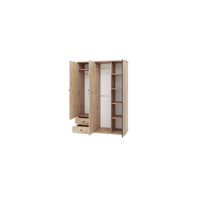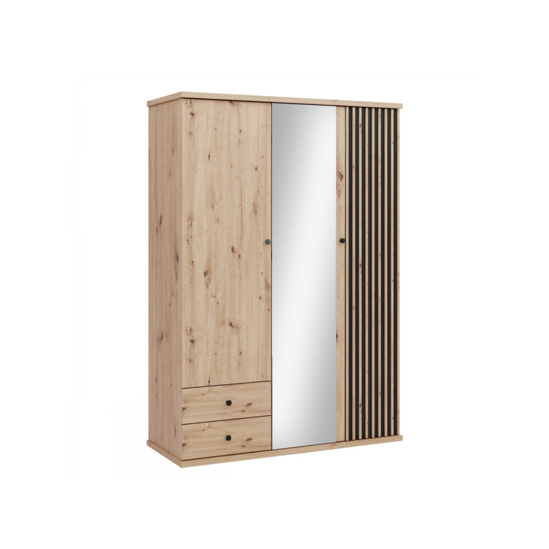 Šatní skříň Sigeren SG23 nabízí dostatek úložného prostoru ve stylovém designu. Interiér byl navržen s ohledem na maximální funkčnost. Obsahuje tři věšáky na oblečení pro pohodlné uložení na ramínkách. Kromě toho série praktických polic umožňuje organizovat oblečení, ložní prádlo a doplňky. Ve spodní části jsou dvě prostorné zásuvky, ideální na drobnosti nebo spodní prádlo. Tato zrcadlová ložnicová šatní skříň se perfektně hodí do elegantních interiérů a interiérů ve stylu loftu. Její charakteristickým znakem je vertikální drážkovaná úprava na jedné z předních částí.