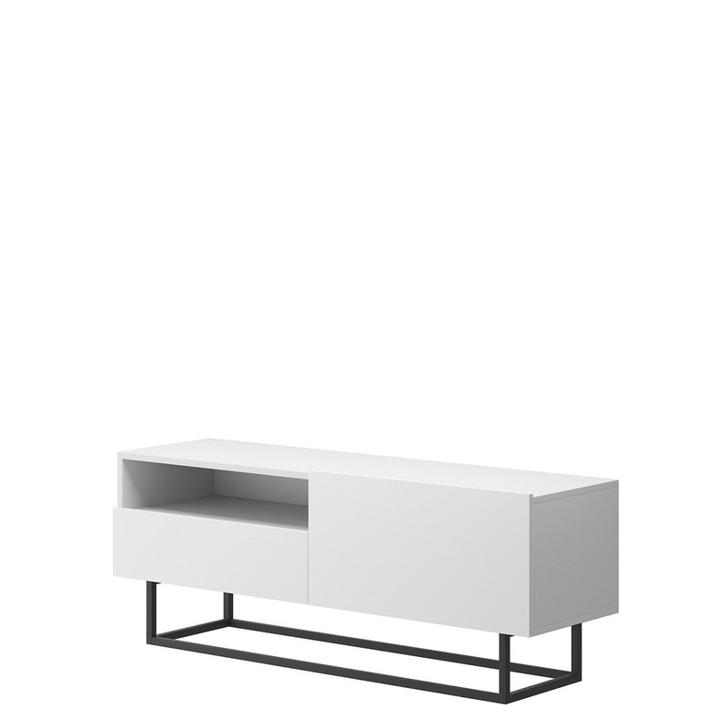 Televizní skříňka Claude je namontována na kovovém rámu. Taková základna zdůrazňuje její moderní vzhled a také dokazuje, že kus nábytku dokonale ladí s průmyslovým stylem.