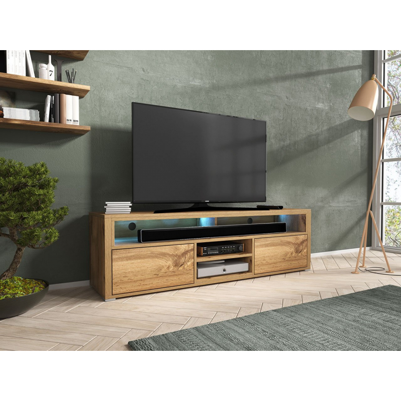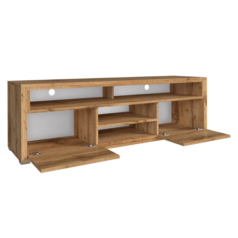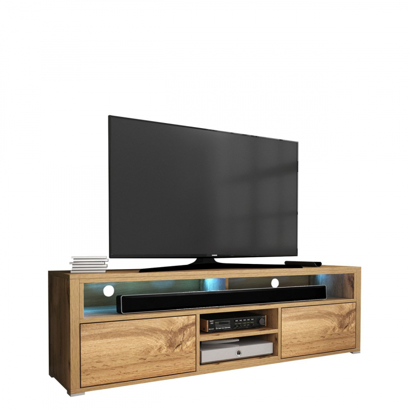 Televizní skříňka je vyrobena z kvalitní dřevotřísky s módními barvami. Tento model je vybaven prostornými policemi, které umožňují udržovat pořádek mezi elektronickými zařízeními.
