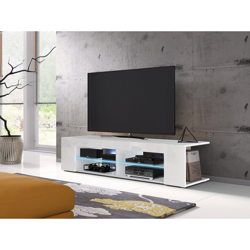 Televizní skříňka je vybavena kromě široké stolové desky skleněnou poličkou s LED osvětlením. Potřebné zvukové zařízení můžete uložit na čtyři police. Další police jsou také umístěny v bočních částech skříně, což vytváří zajímavý vizuální efekt.