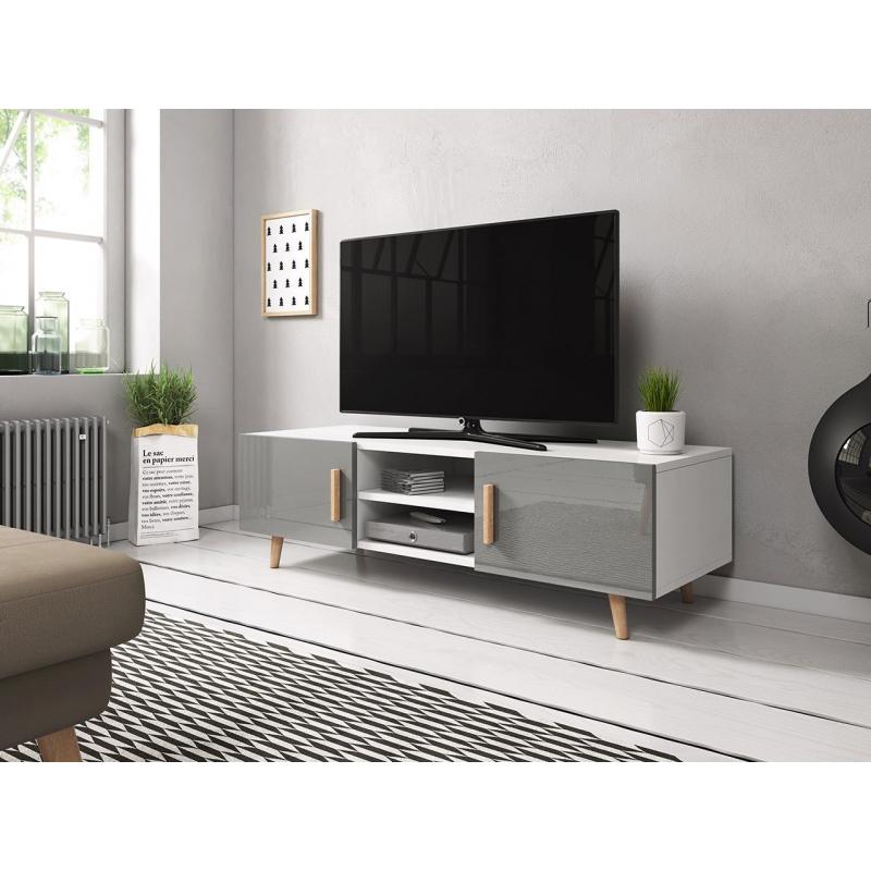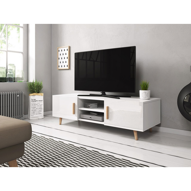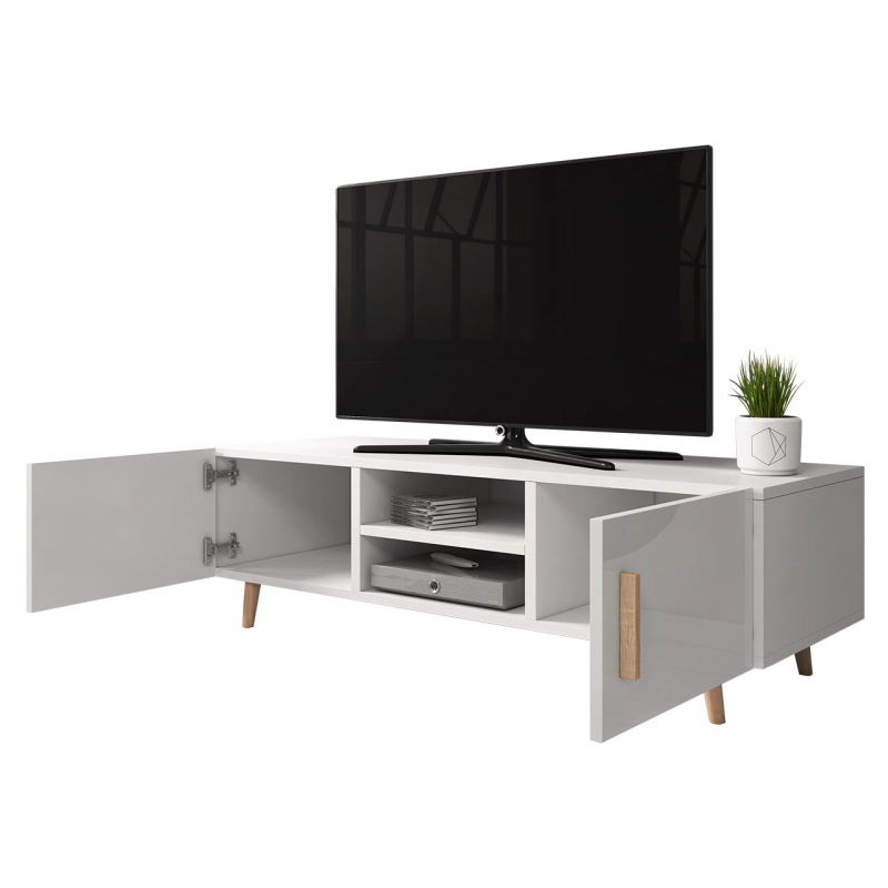 Stylová televizní skříňka Baca je kus nábytku vhodný do moderní obývacího pokoje. Štíhlé nohy a rukojeti vyrobené ze dřeva také umožňují dobrý vzhled ve skandinávských interiérech. Z hlediska funkčnosti poskytuje televizní skříňka mnoho prostoru pro potřebné televizní příslušenství. Otevřené police a skříňky s plnou přední částí jsou dokonalým místem pro set-top box, hry, desky a sluchátka.
