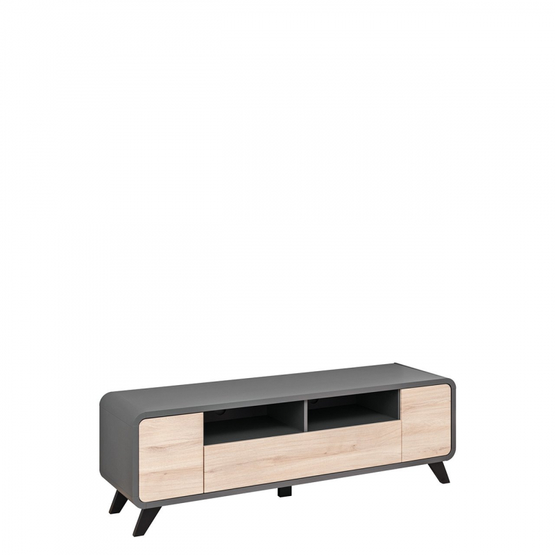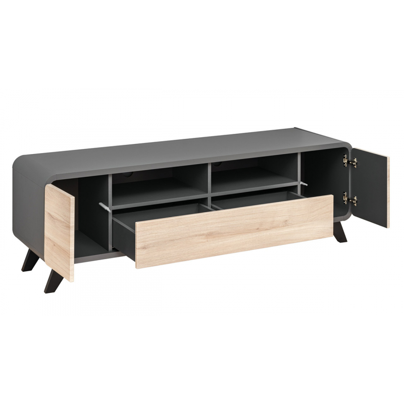 Televizní skříňka Ezekiel je vybavena prostornou zásuvkou a úkryty, které vám umožní uložit nejnutnější věci. Tento model byl obohacen o módní, černé dřevěné nohy, které dodávají nábytku lehkost a jedinečnost.