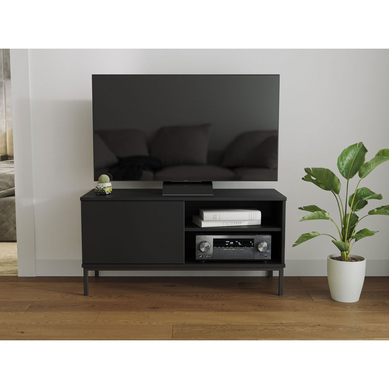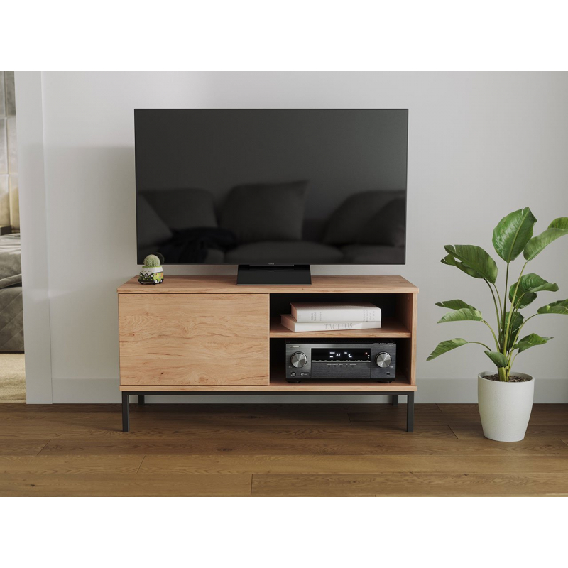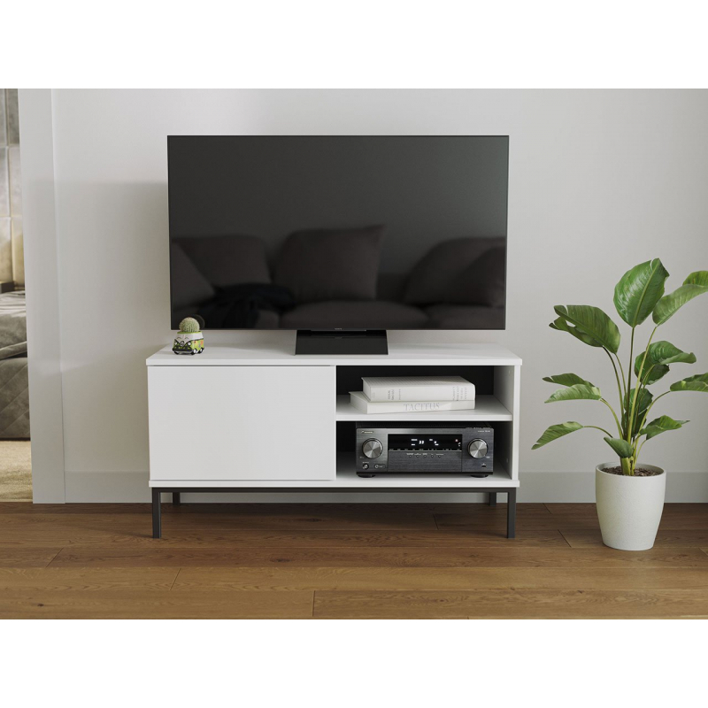 Pro menší místnosti máme speciální nabídku: TV stolek 1D Marinez, šířka 101 cm. Jeho minimalistický tvar navíc nezahltí místnost. Zvláštností prezentovaného TV stolku jsou dlouhé, štíhlé nohy, které dodávají nábytku lehkost. Kromě toho je TV skříňka vybavena dvěma otevřenými policemi a barovou skříňkou, která se otevírá systémem PUSH TO OPEN.