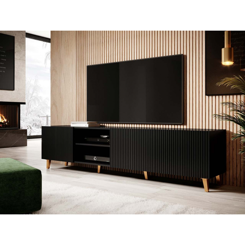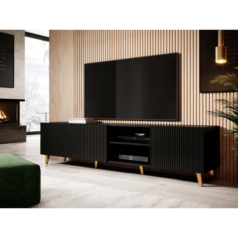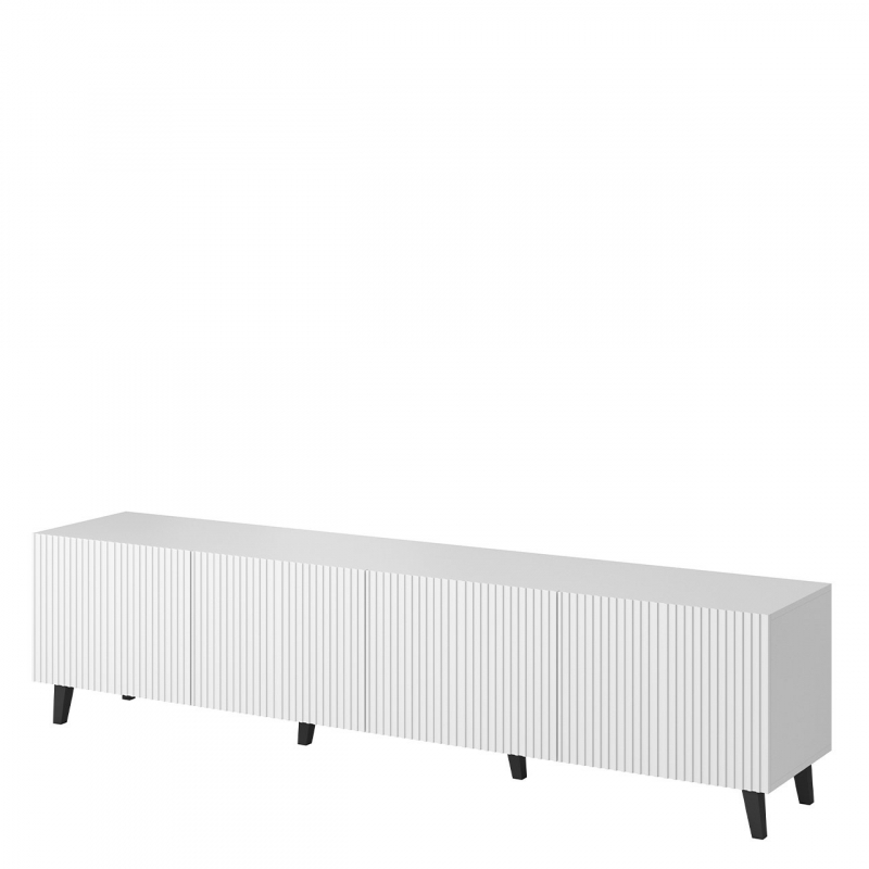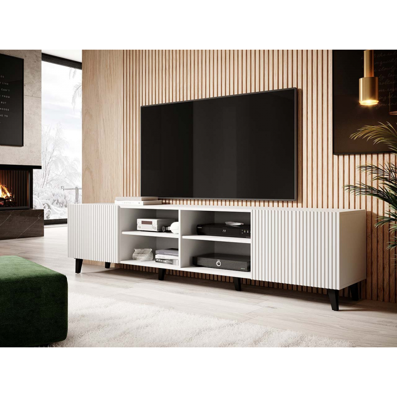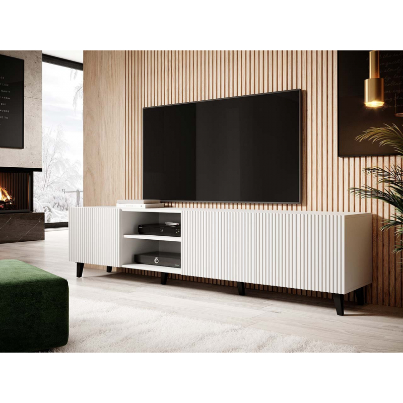 TV skříňka Sinenko 200 je moderní a bude vypadat skvěle v inovativní domácnosti. Nábytek je natolik jedinečný, že se bude hodit k jinému nábytku, který nemusí mít nutně podobný styl. Jeho sladění se zbytkem interiéru závisí na vašem individuálním stylu. Přední části vděčí za svůj jedinečný vzhled podélným frézám, které vytvářejí nezapomenutelný inovativní design. Televizní stolek má interiér velmi prostorný, rozdělený do mnoha polic, abyste si mohli vybrané věci jednoduše roztřídit.
