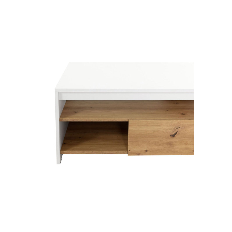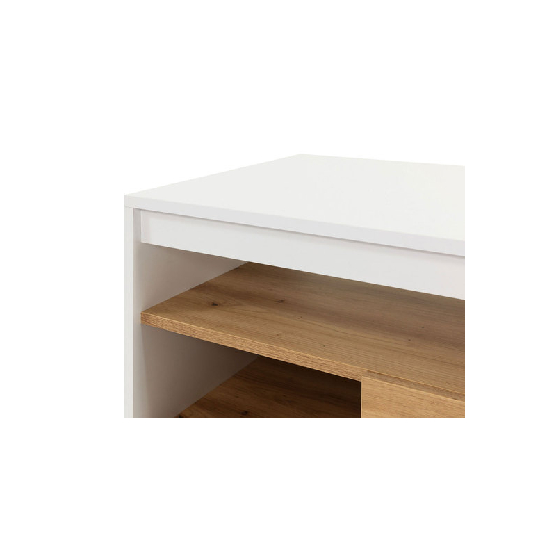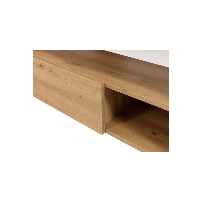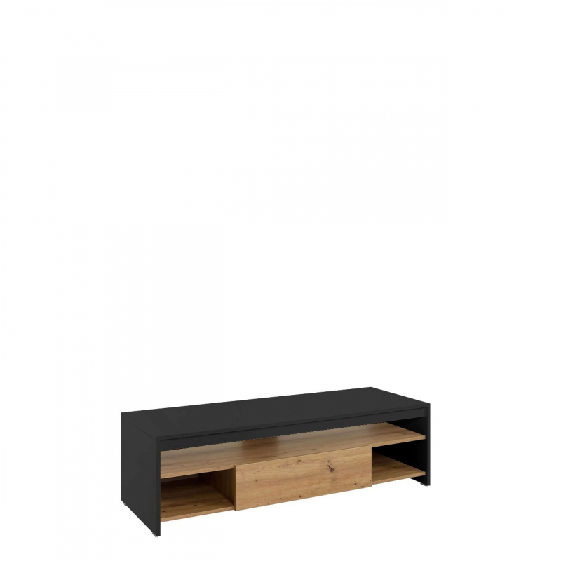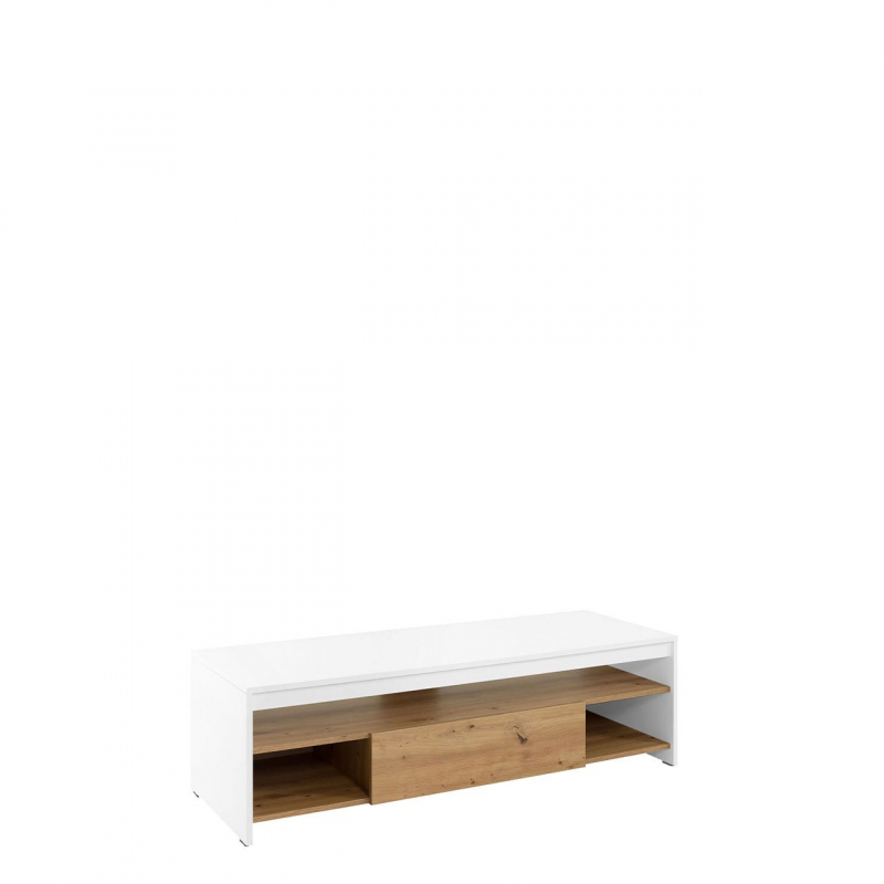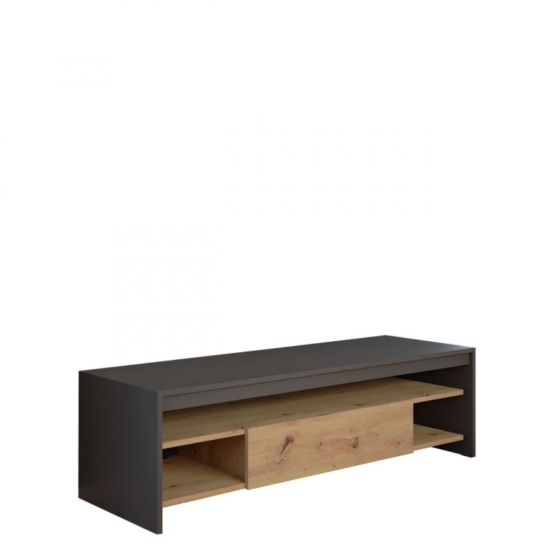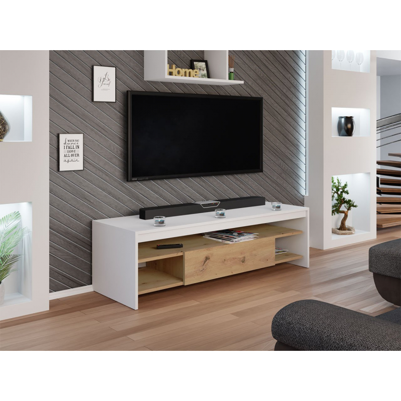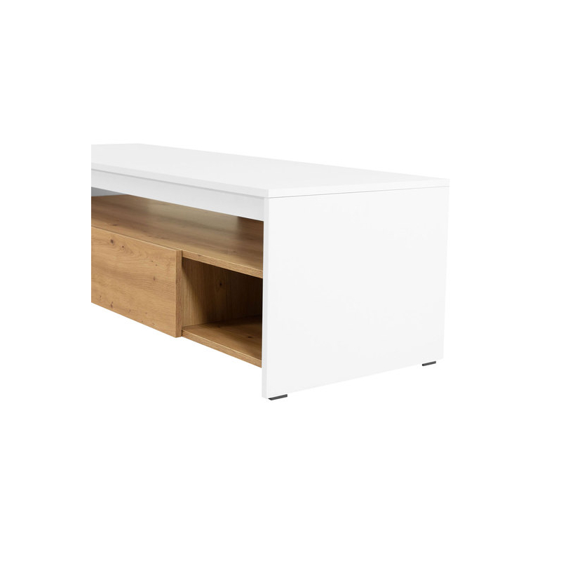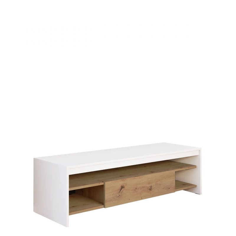 TV skříňka má celkem čtyři police a desku, jedna je uzavřena, nad ní je police, která je ideálním místem pro umístění TV set-top boxu nebo herní konzole s příslušenstvím. Pod spodní deskou nábytku je prostor, který usnadní úklid bytu bez nutnosti přesouvání skříňky, neboť se její dno nedotýká země.