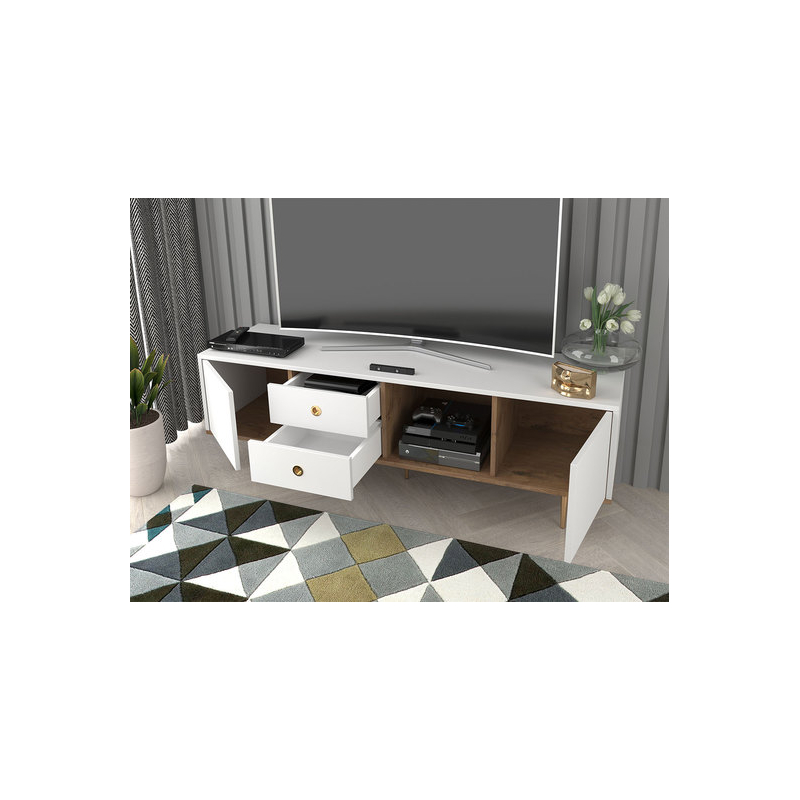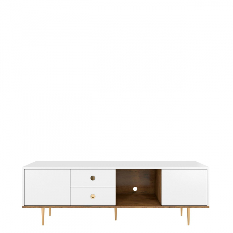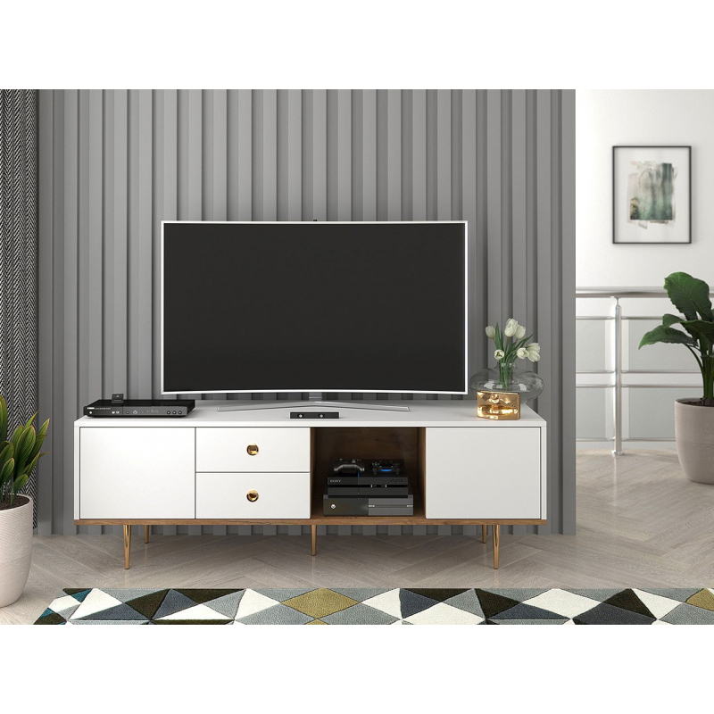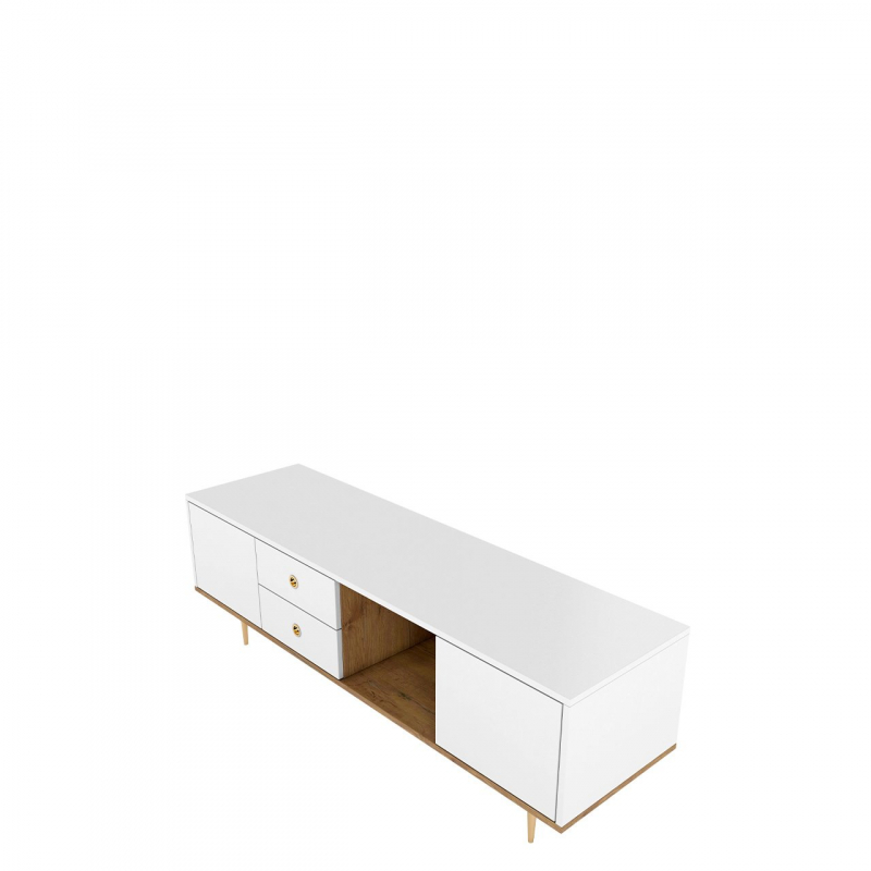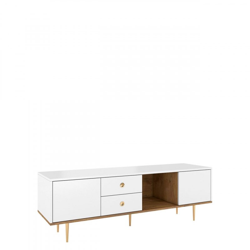 Komoda RTV Dacken 2 může stát ve vašem obývacím pokoji nebo pokoji v moderním nebo glamour stylu. Tento kus nábytku má detaily, které mu dodávají luxusní vzhled. Vyšší nohy ve zlaté barvě v kombinaci s originálními úchyty a dřevěným interiérem jsou důkladně promyšleným konceptem designéra nábytku.