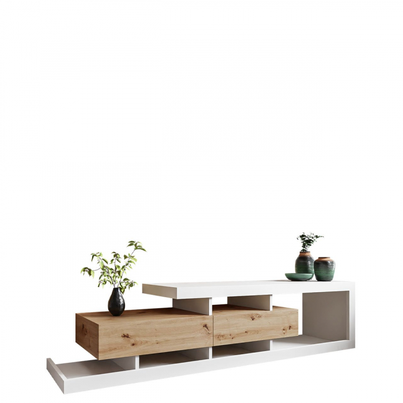 Televizní stolek má dvě zásuvky a spoustu volného prostoru pro umístění vybraných předmětů. Set-top box lze umístit na horní část nábytku nebo pod něj na polici pod deskou nábytku. Zadní strana má záměrně prázdný prostor, aby bylo snazší skrýt kabely ze zařízení.