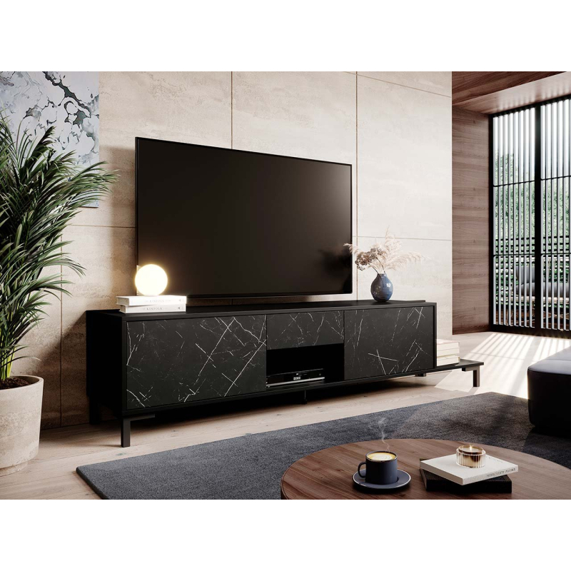 Z hlediska funkčnosti nabízí televizní stolek chytře uspořádaný úložný systém. Mezi různými úložnými prostory najdete výklopné skříňky, zásuvky a otevřené police. Jedna z nich je zbavena horní části, takže na ni můžete umístit například vysokou lucernu, vázu s čerstvými květinami nebo jiné dekorace.
