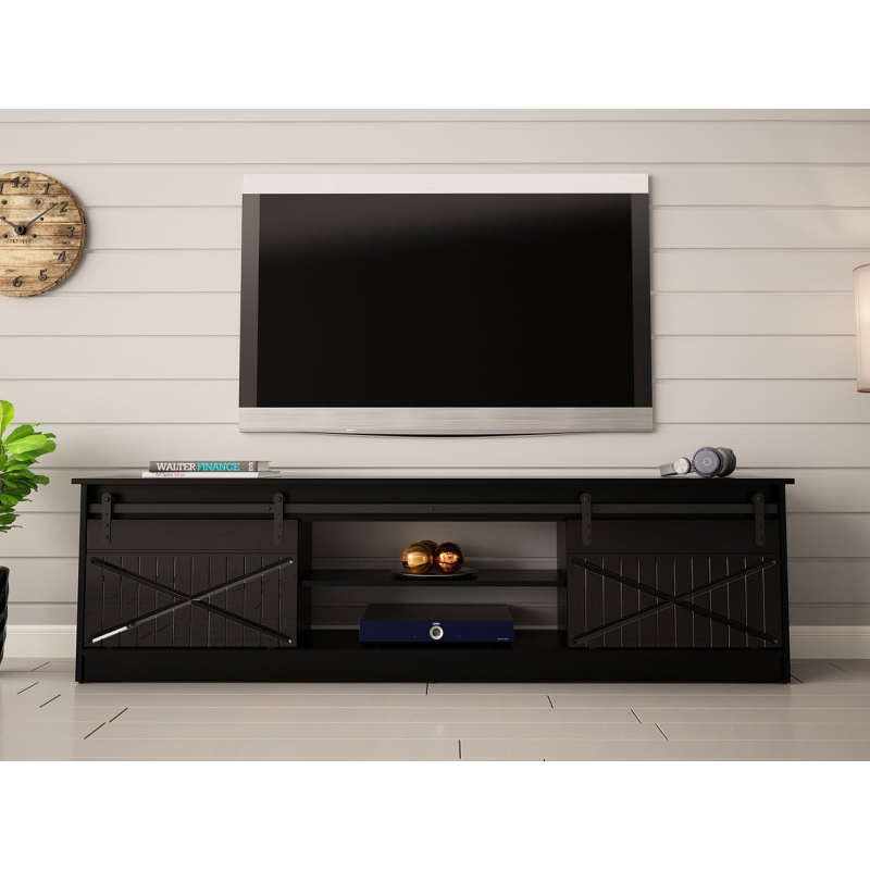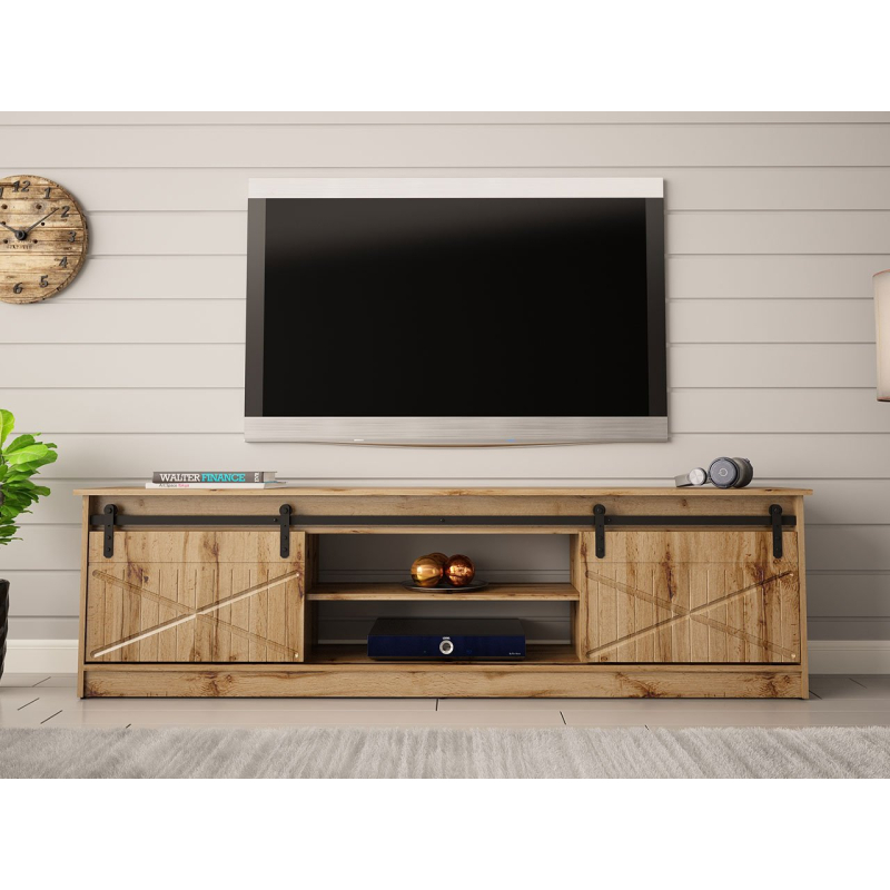 Televizní skříňka je vyrobena z matné laminované desky, ale přední strana je lesklá. Je také vybavena posuvným systémem LOFT LAGUNA. Poskytuje ideální místo pro multimediální zařízení i drobné ozdoby. Kromě toho nabízí také uzavřený prostor pro ukrytí různých předmětů.