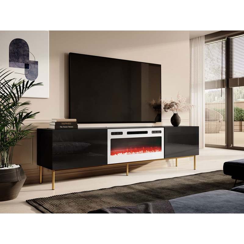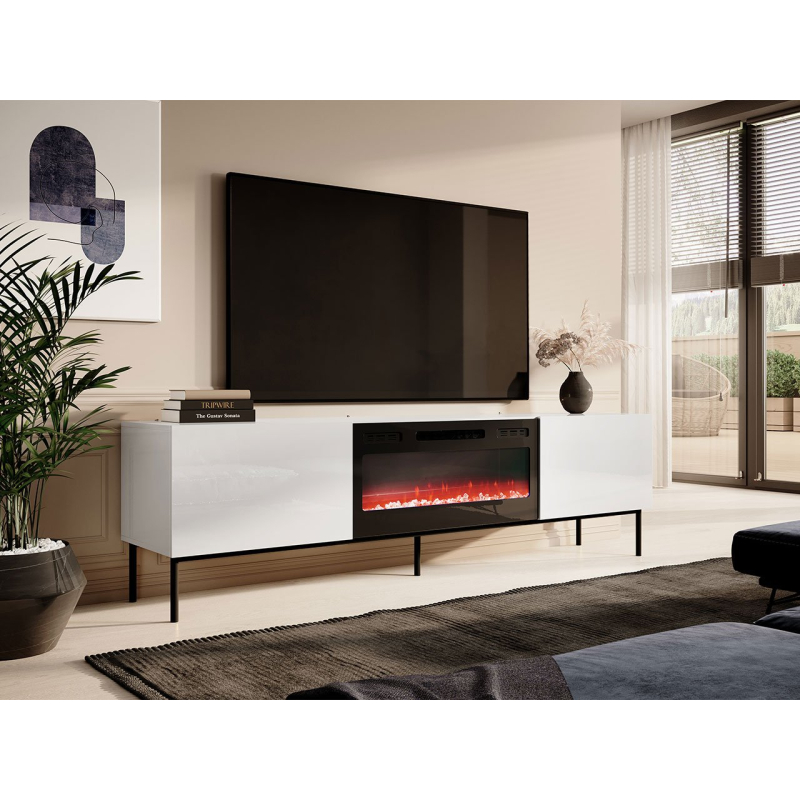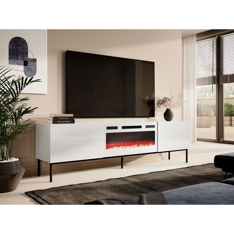 Je to moderní návrh pro mnoho aranžmá. Krásná lesklá čela doplněná krbem a stabilním rámem promění váš interiér a získají jedinečnou záři. Televizní skříňka má také police skryté za dvířky, vybavené systémem „PUSH TO OPEN“. Je vybavena funkcí ohřevu s regulací teploty v rozsahu 18-35°C a dálkovým ovládáním.