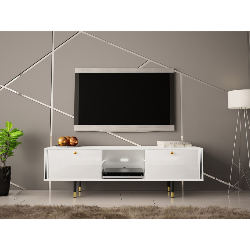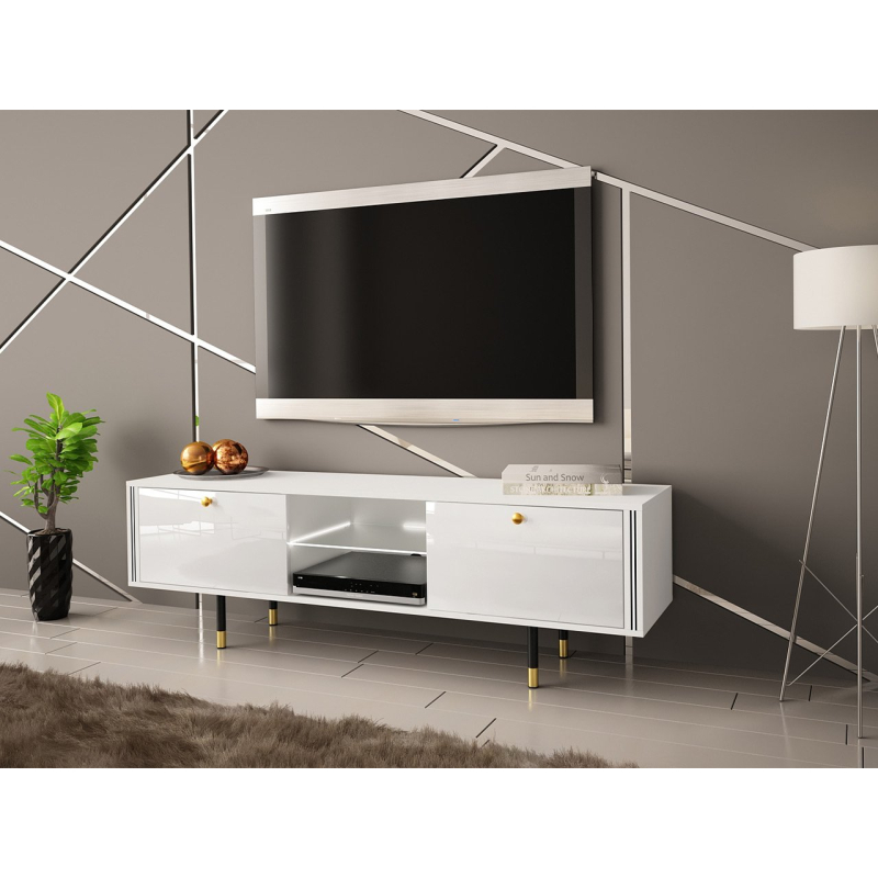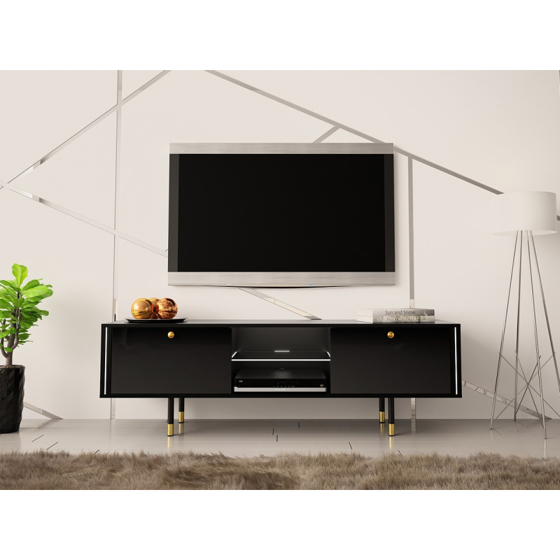 Televizní skříňka má uzavřené úložné prostory, které jsou skryté za dvířky, které se otevírají díky pohonům. Navíc je vybavena také poličkou z tvrzeného skla. Jeho neobvyklý design je zdůrazněn jemnými úchyty a nohami se zlatým zakončením. Součástí sady je i LED osvětlení, které ještě více obohatí nevšední vzhled tohoto modelu.
