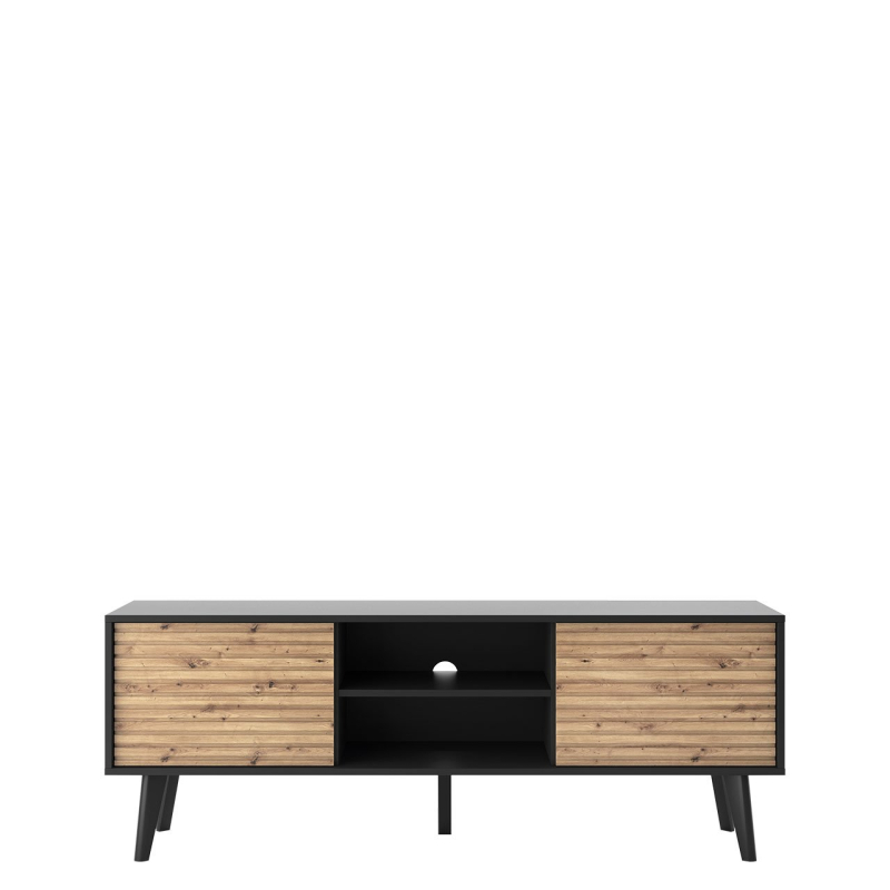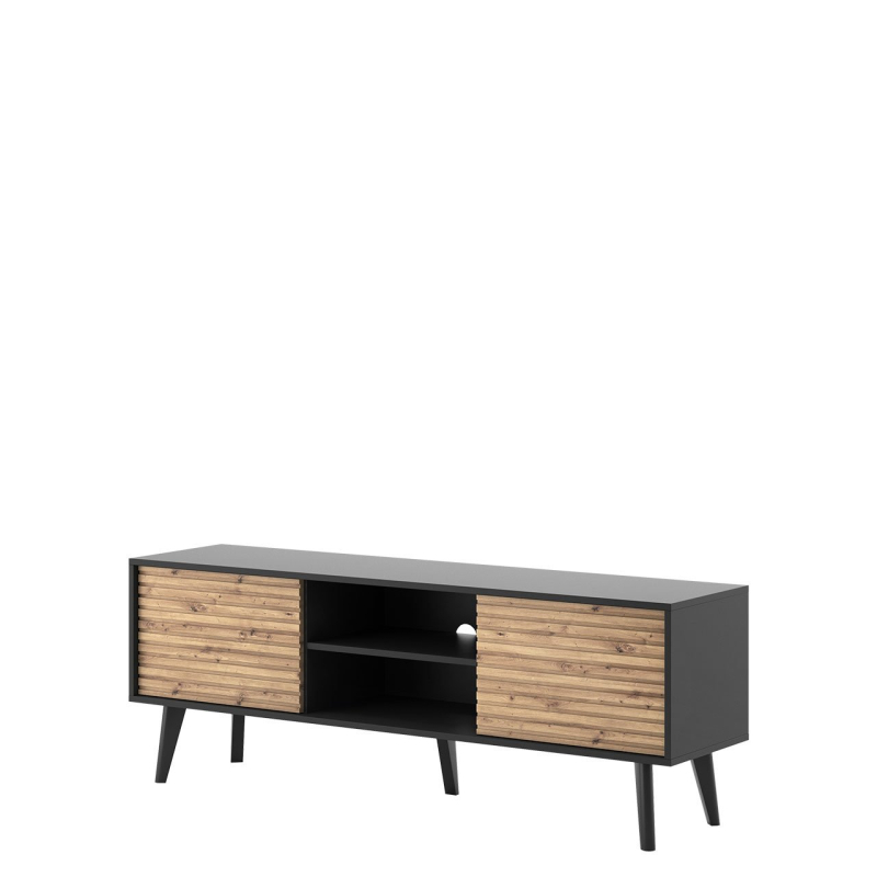 Jedinečný charakter podtrhují frézovaná čela skříněk. Tento dekor TV skříňku do obývacího pokoje rozhodně odlišuje od ostatních modelů. Skříňka pod televizor má navíc díky svému prostoru ideální úložný prostor pro elektronická zařízení a další příslušenství. Jistě se stane ústředním bodem uspořádání obývacího pokoje a dodá každému interiéru stylový nádech.