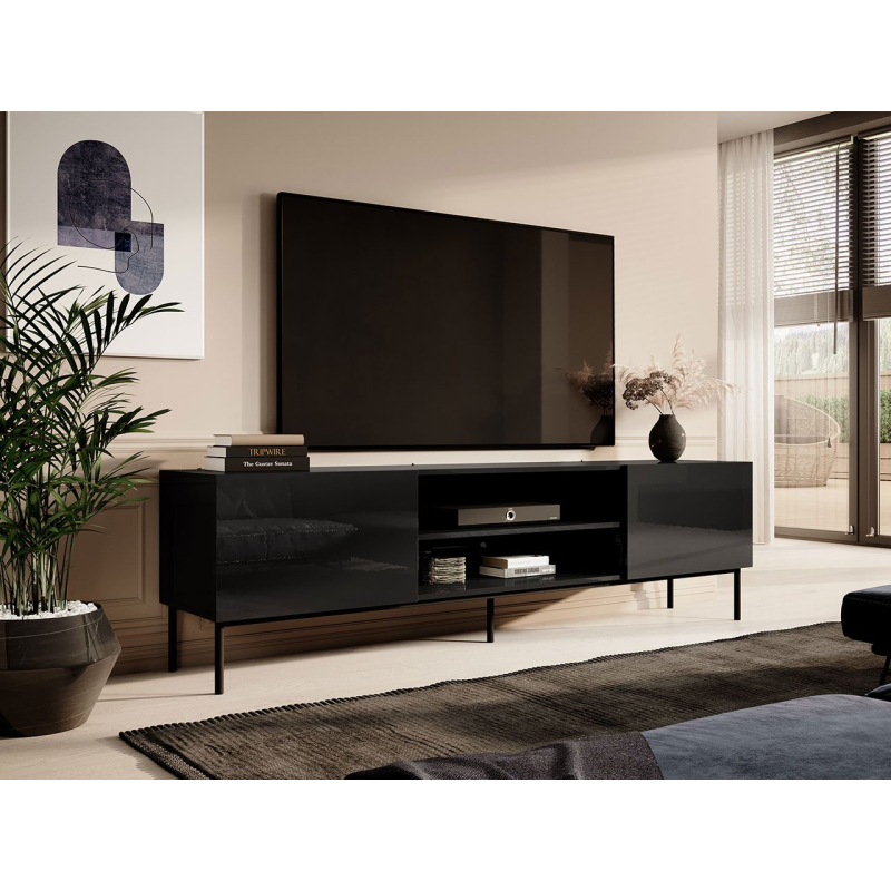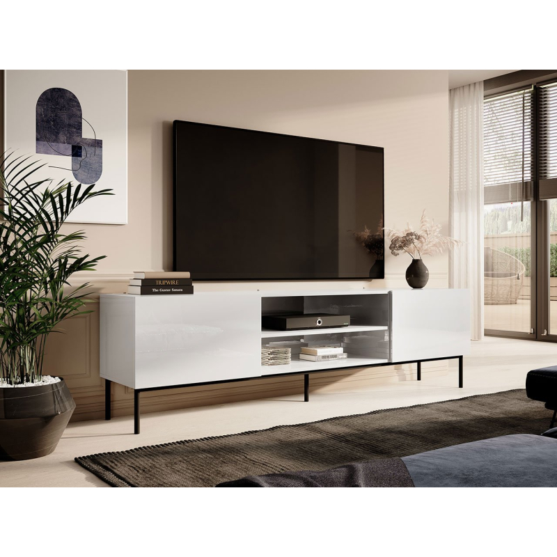 Čela, horní část, boky a hrany jsou vyrobeny z desky s vysokým leskem. Toto řešení dokonale odráží světlo, díky čemuž se místnost opticky zvětší. Skříňka RTV je vybavena systémem otevírání "PUSH TO OPEN". Má otevřené a zavřené police. Kovový rám umožní snadné čištění podlahy.