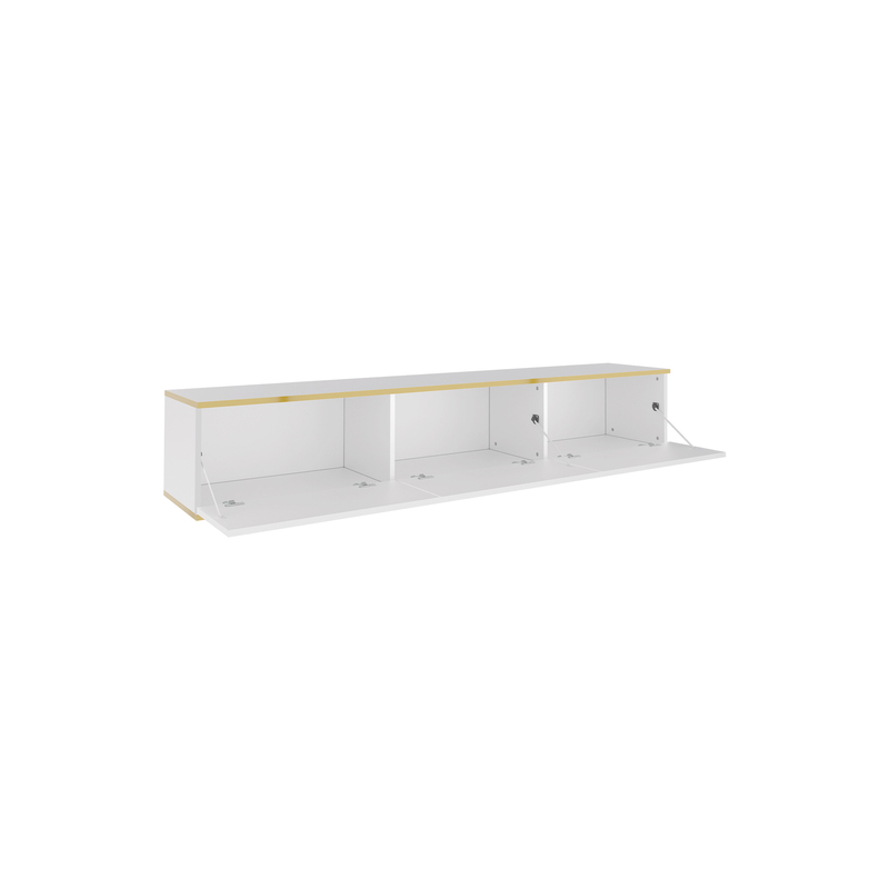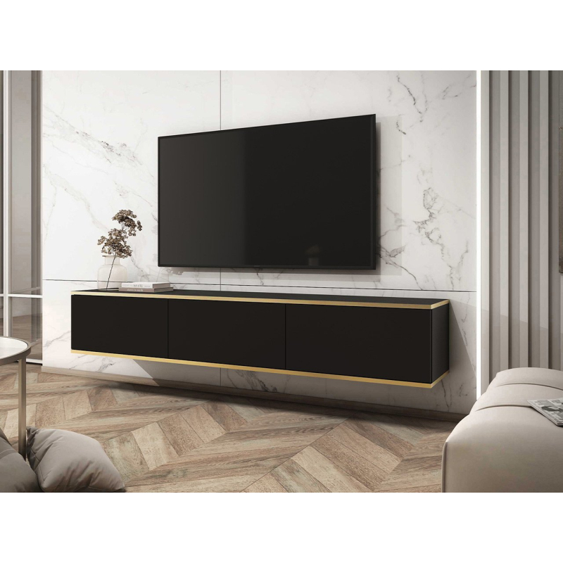 Zlaté detaily dodávají skříni eleganci a moderní výraz, přitom jsou decentní a nenápadné. Televizní skříňka je zavěšená, což v obývacím pokoji působí lehce a prostorově. Díky tomu lze v obývacím pokoji snadno udržovat pořádek.