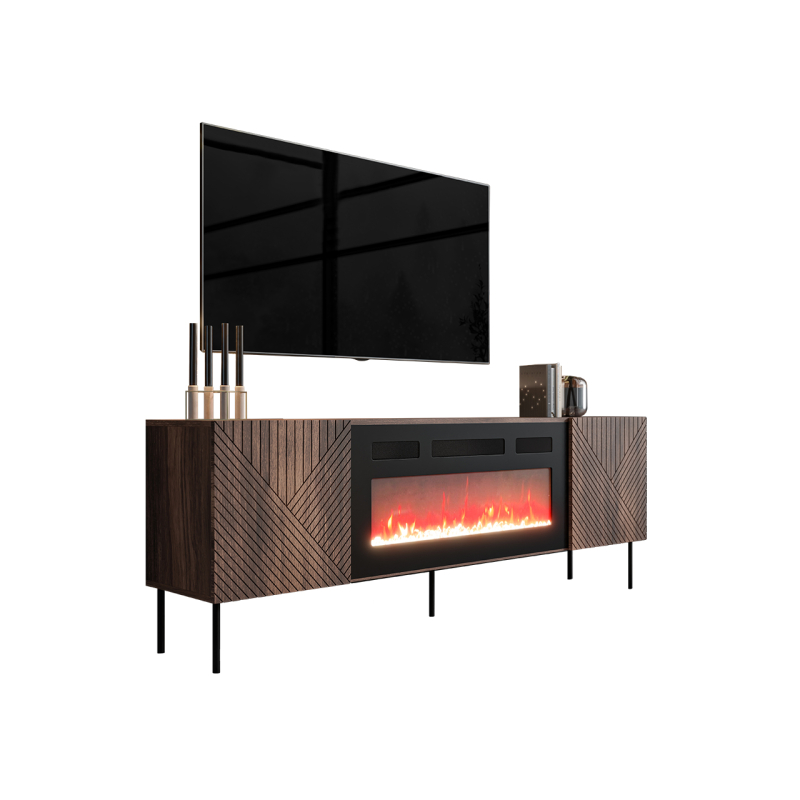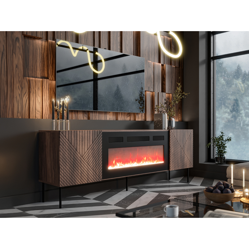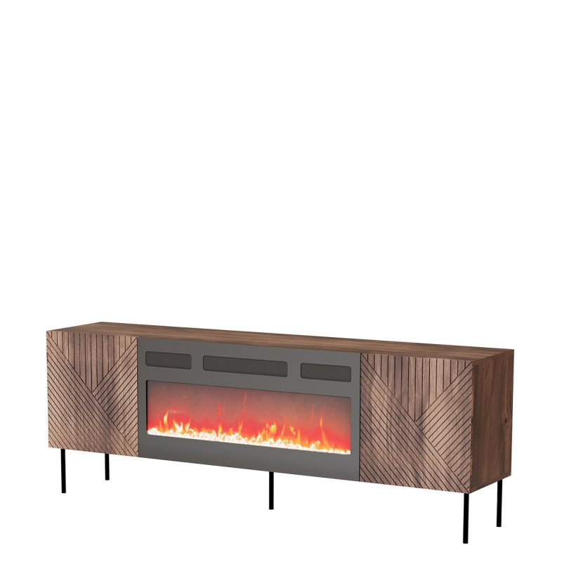 Dotek moderny vnáší do dekoru obývacího pokoje TV skříňka Azynit 190 cm. Nábytek vybavený krbem zpříjemní večerní relax se sklenkou vína v ruce nebo při sledování oblíbeného seriálu. Záře vycházející z realistického plamene vnáší do místnosti přátelskou atmosféru relaxace.