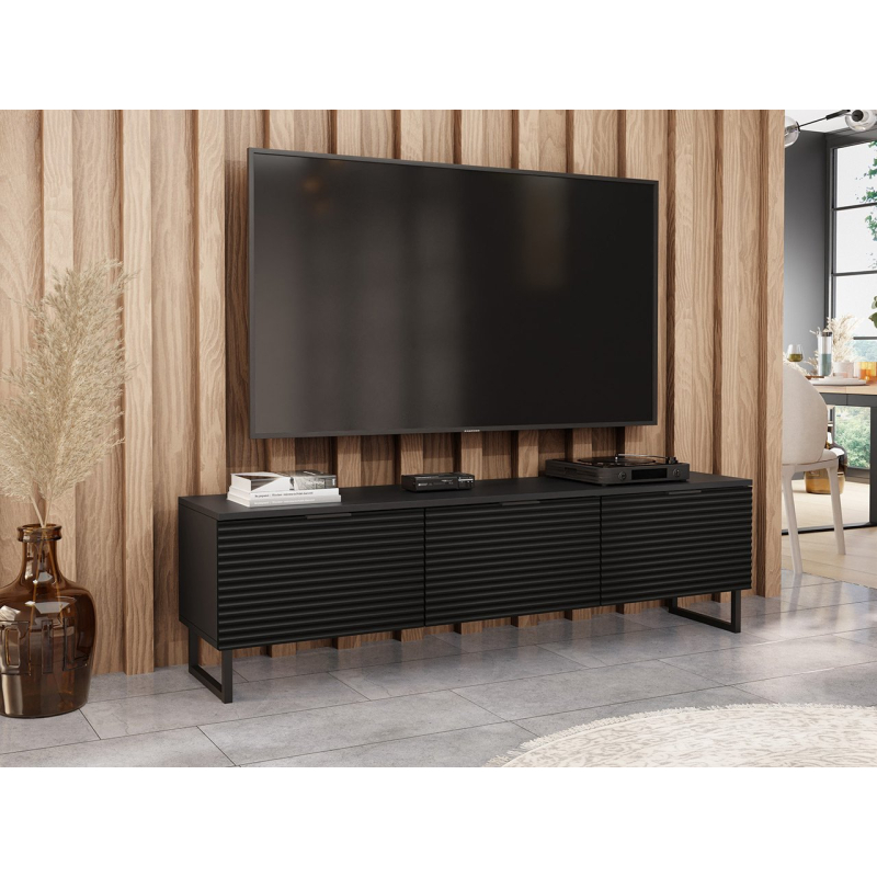 Prostorný interiér je vynikající základnou pro desky, knihy a další doplňky. Do prostorné horní části TV skříňky se vejde různá audiovizuální technika a drobné dekorace. Kovové nohy působí lehkým dojmem modelu a nezatěžují okolí svou přítomností. Toto řešení také umožňuje snadné čištění.