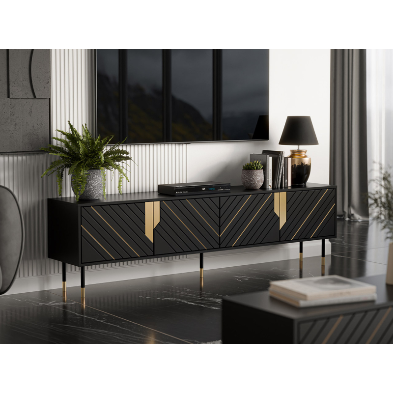 Prezentovaný model je kombinací moderního designu a funkčnosti. Dekorativní čela a vysoké nohy jsou skvělým způsobem, jak stylově uspořádat interiér. Do TV skříňky však můžete umístit různé předměty každodenní potřeby. Televizní skříňka vám díky vyšší struktuře umožní snadno udržovat pořádek na podlaze.