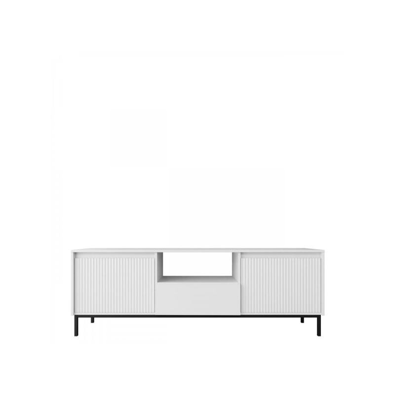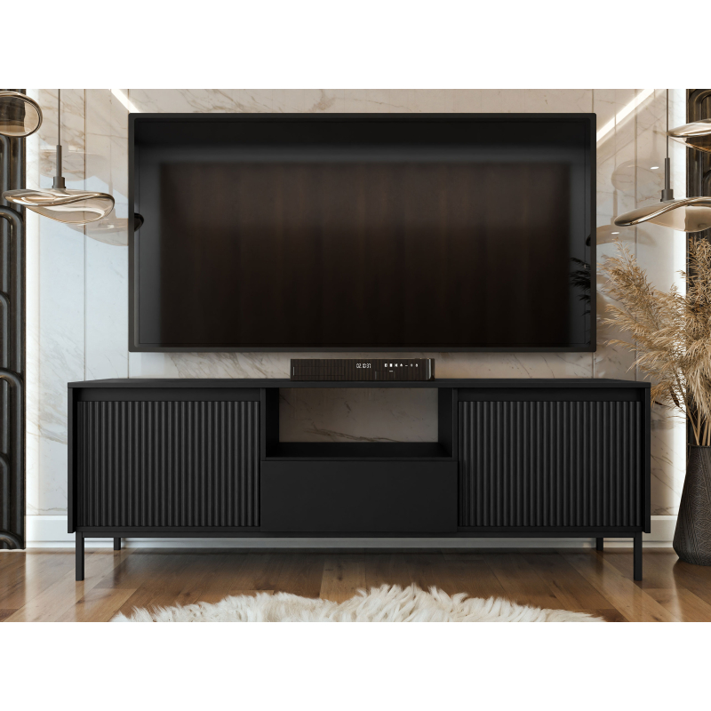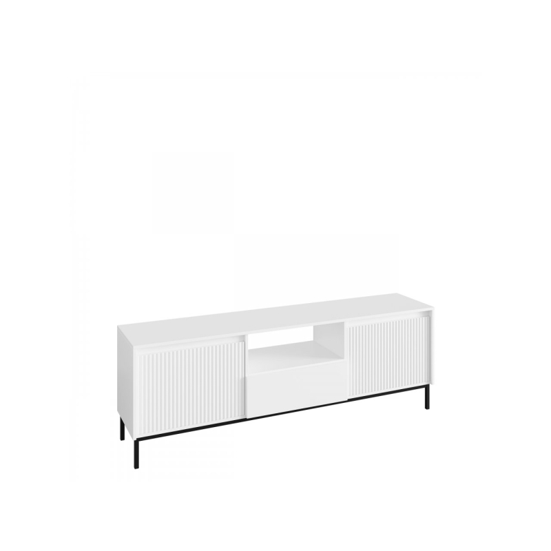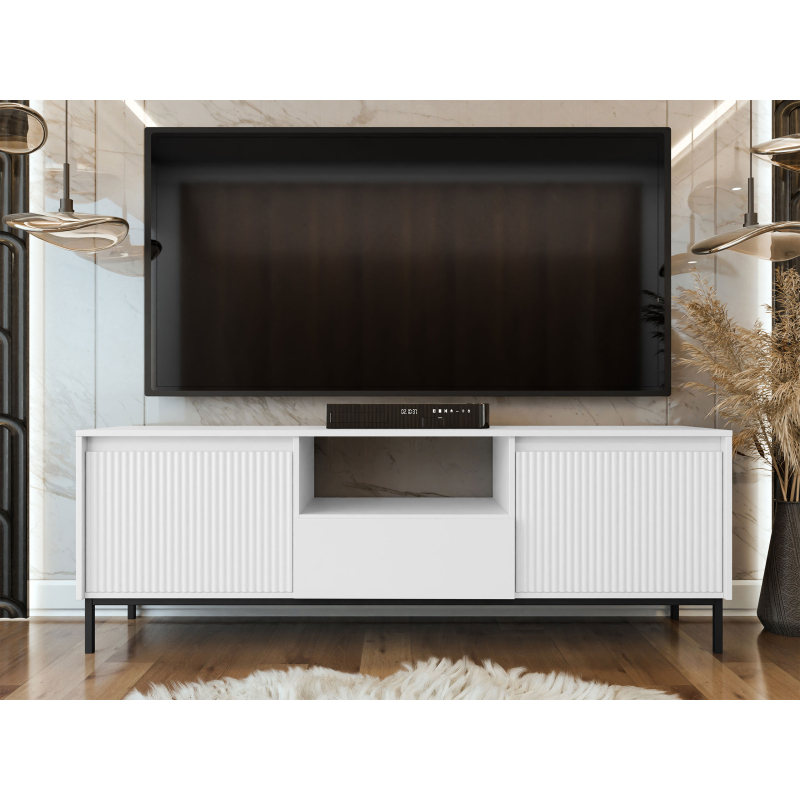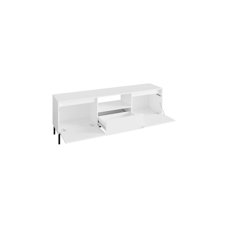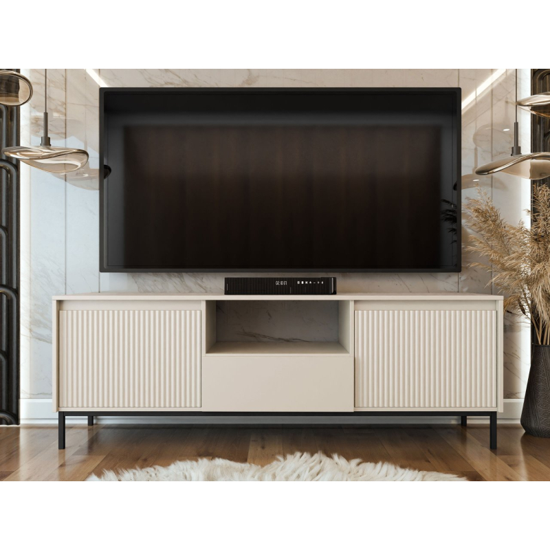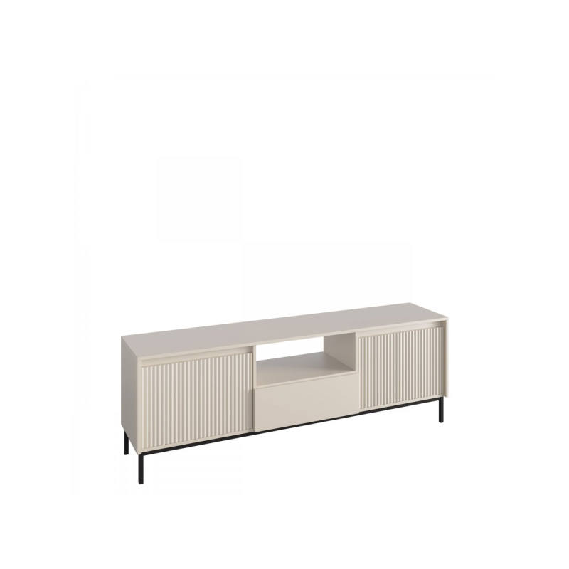 Kromě funkčnosti zaujme prezentovaný TV stolek také krásným vzhledem. Podmanivá čela s různými texturami tvoří zajímavý celek. Celá konstrukce TV skříňky je doplněna kovovým rámem, který dodává celému nábytku jemnou lehkost.