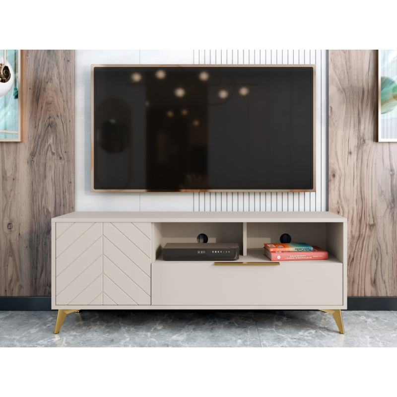Vizuální kvality TV stolku Siprynt 1D1SZ vycházejí z neutrálních barev. Světlá barva podpořená zlatými detaily zdůrazňuje avantgardní charakter výzdoby obývacího pokoje. Designovým akcentem je frézování na čelech.