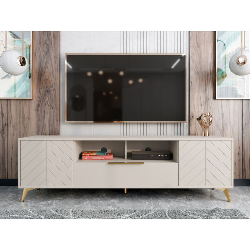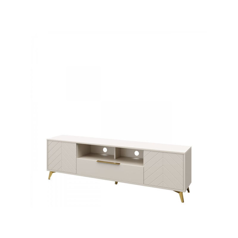 Originální vzhled TV skříňky Siprynt 2D1SZ ozdobí interiér stylově zařízeného obývacího pokoje. Módní barvy dodají dekoraci moderní charakter a jedinečný styl umocní frézovaný vzor rybí kosti na předních stranách. Designové nohy také dodávají televiznímu stojanu živost.