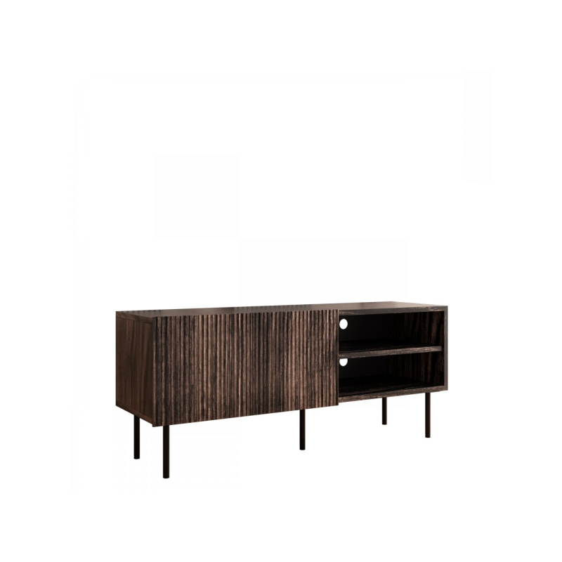 TV stolek/skříňka Ostani 150 2D na nožičkách vyzařuje eleganci a styl typický pro období designu Art Deco. Přední části jsou decentně zdobeny geometrií v podobě podélných linií a tělo je osazeno na vysokých nožičkách, které dodávají televiznímu stojanu lehkost.