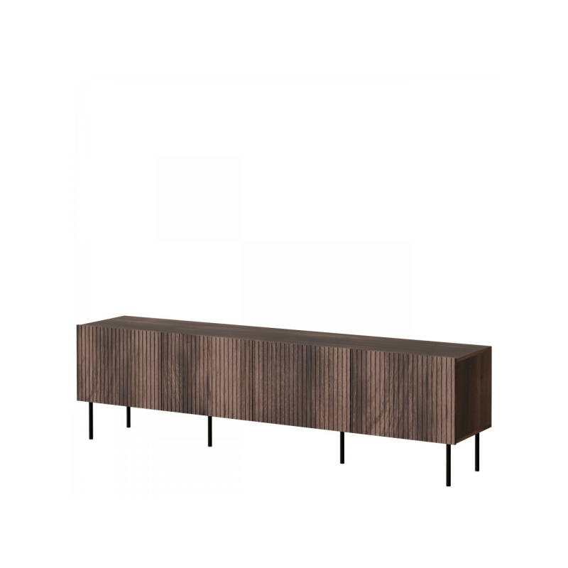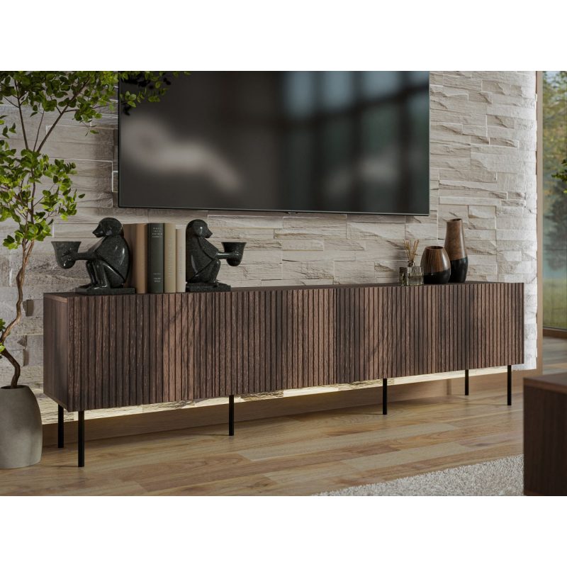Velká TV skříňka Ostani 200 cm 4D se nese v duchu minimalismu. Geometrický tvar bez úchytek působí skromně. Harmonii z ní vyzařující podporují i drážkovaná čela. Módní ozdobou jsou symetrické drážky na dvířkách. Zvýrazňuje původní charakter nábytku as ním i design celého interiéru.