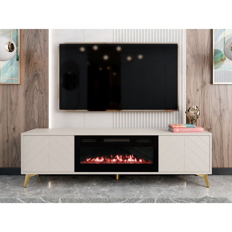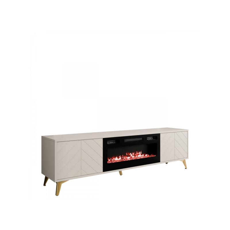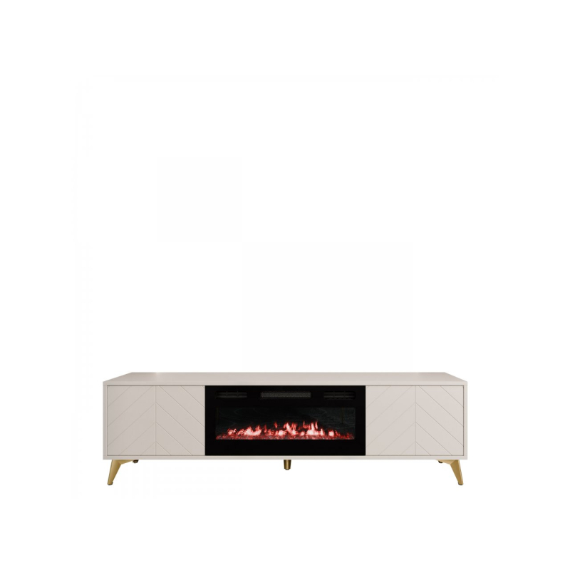 TV skříňka Siprynt 2D EF s krbem je výjimečnou volbou do obývacího pokoje. Elegantní TV skříňka s inovativním doplňkem. Ve vaší domácnosti se postará o velkolepý efekt. Má jemný a moderní design a zlaté prvky dodávají nábytku prestižní vzhled. Skříňka na nožičkách se vyznačuje také jemným geometrickým dekorem na čelech. Model nabízí také dva prostorné úložné prostory, se kterými budete mít pořádek. Hlavním poutačem pozornosti je však elektrický krb. Jedná se o skvělé řešení z vizuálního i funkčního hlediska. Během chladných večerů vyhřeje místnost, zatímco vy se můžete oddávat blaženému odpočinku s hrníčkem horkého čaje.