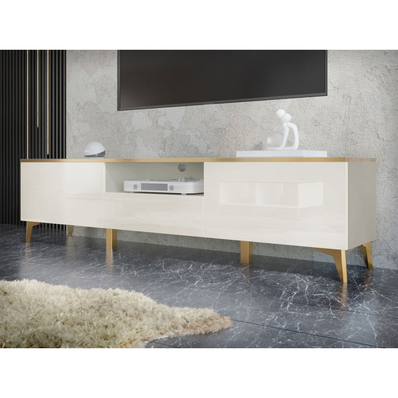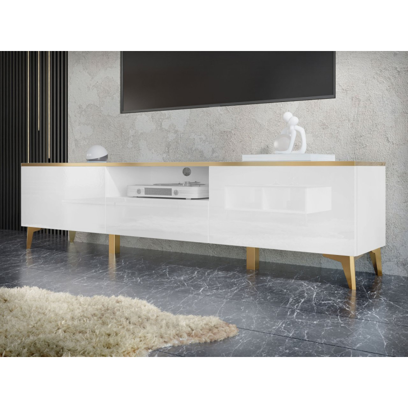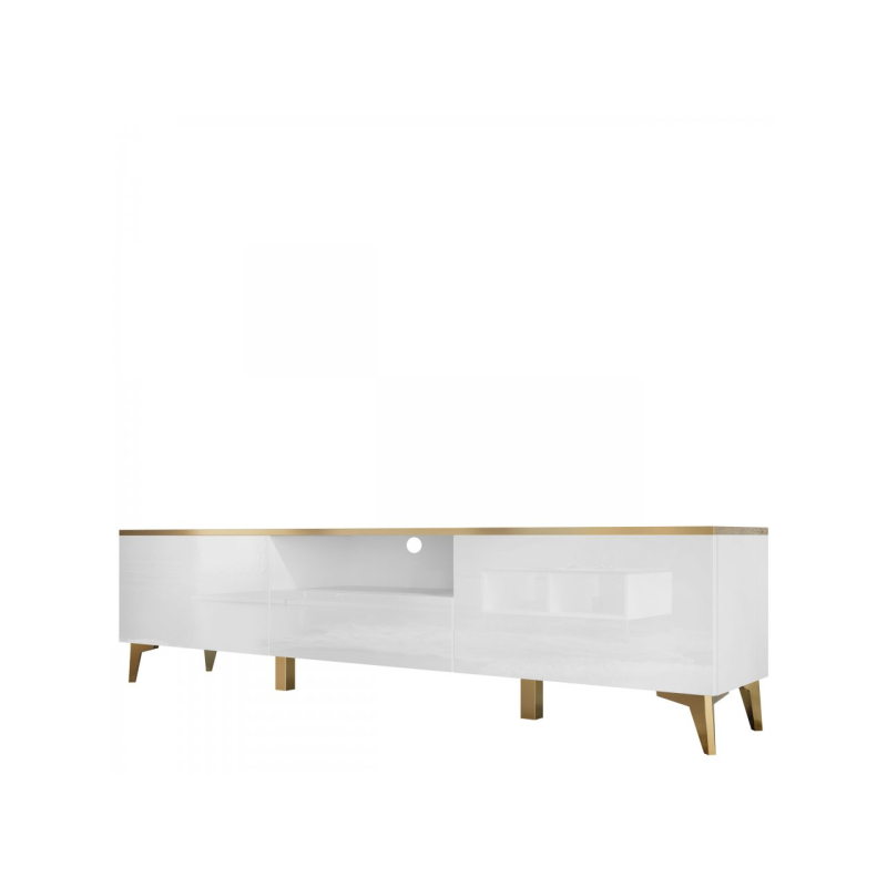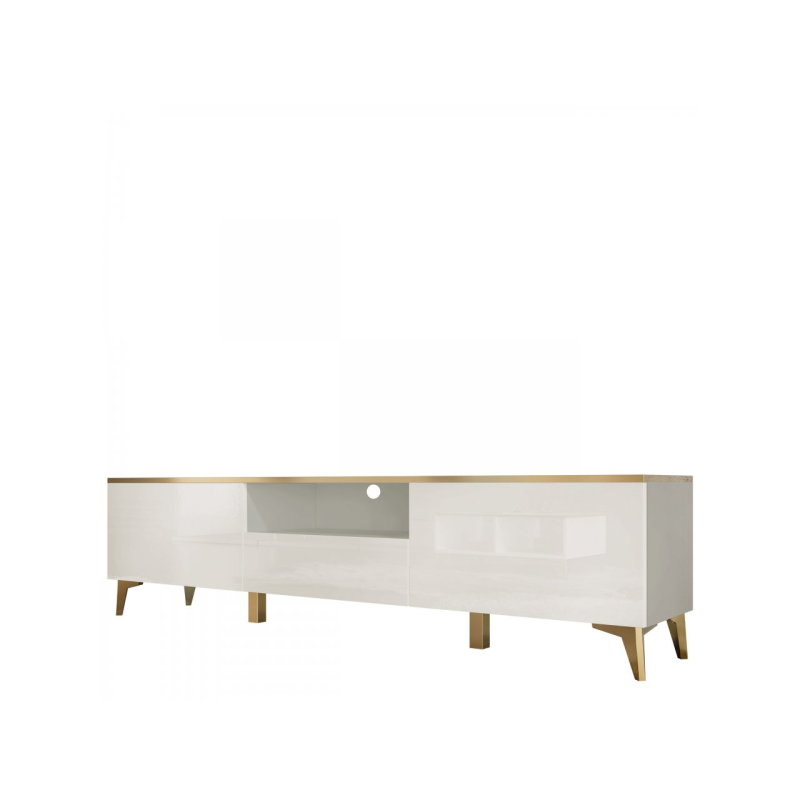 Moderní TV skříňka Outtra 2D1S je skvělým doplňkem do TV prostoru. Ideální pro multimediální vybavení, dekorace a skladování. Zlaté detaily v podobě nožiček a ozdobných prvků dodávají modernost, třídu a eleganci. Dokonale zapadne do minimalistických, moderních a okouzlujících interiérů.